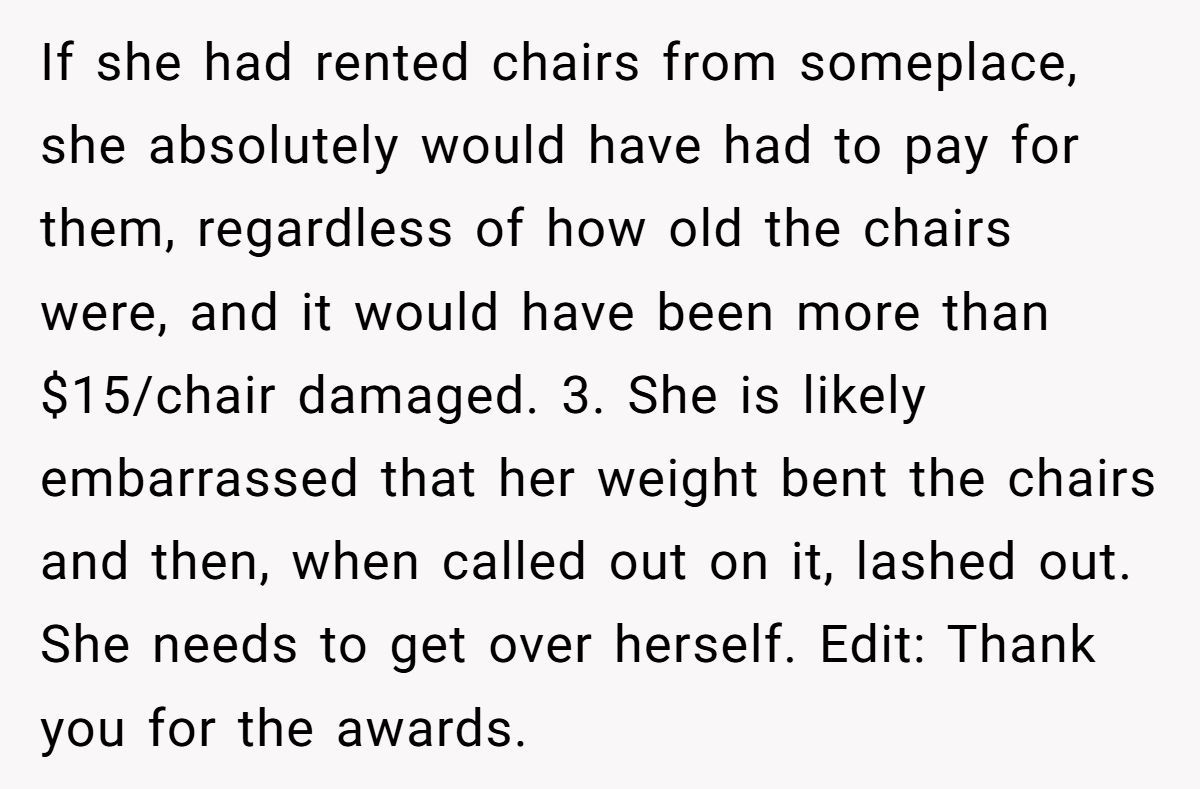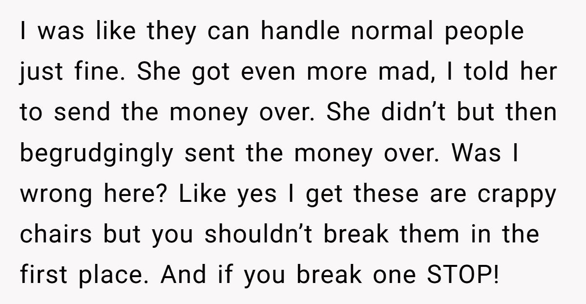 Was $15 per chair a fair ask? Absolutely. That’s not just about money—it’s about acknowledging damage and taking responsibility. The Redditor’s sarcastic “normal people” comment, though, definitely crossed a line.