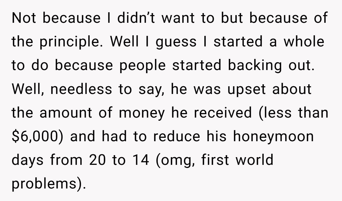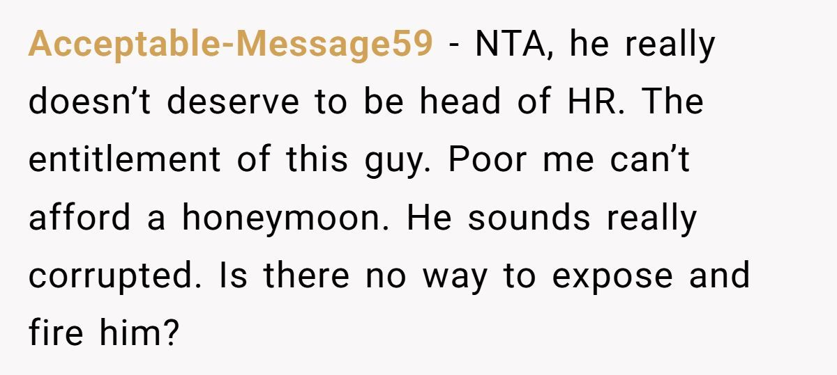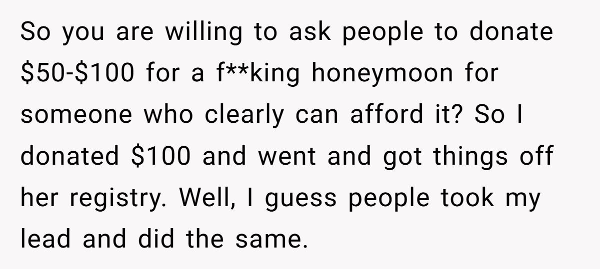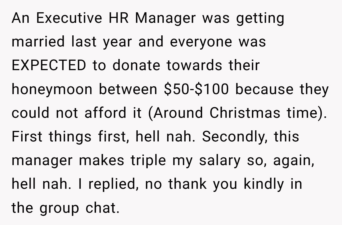 One Redditor walked into a workplace drama that would make your annual review feel like a vacation. When the executive HR manager decided to get hitched, he didn’t just send out invites—he sent out a request for cold hard cash. Not for a venue, not for a cake, but for his honeymoon. The “suggested donation”? A jaw-dropping $50 to $100, per employee.