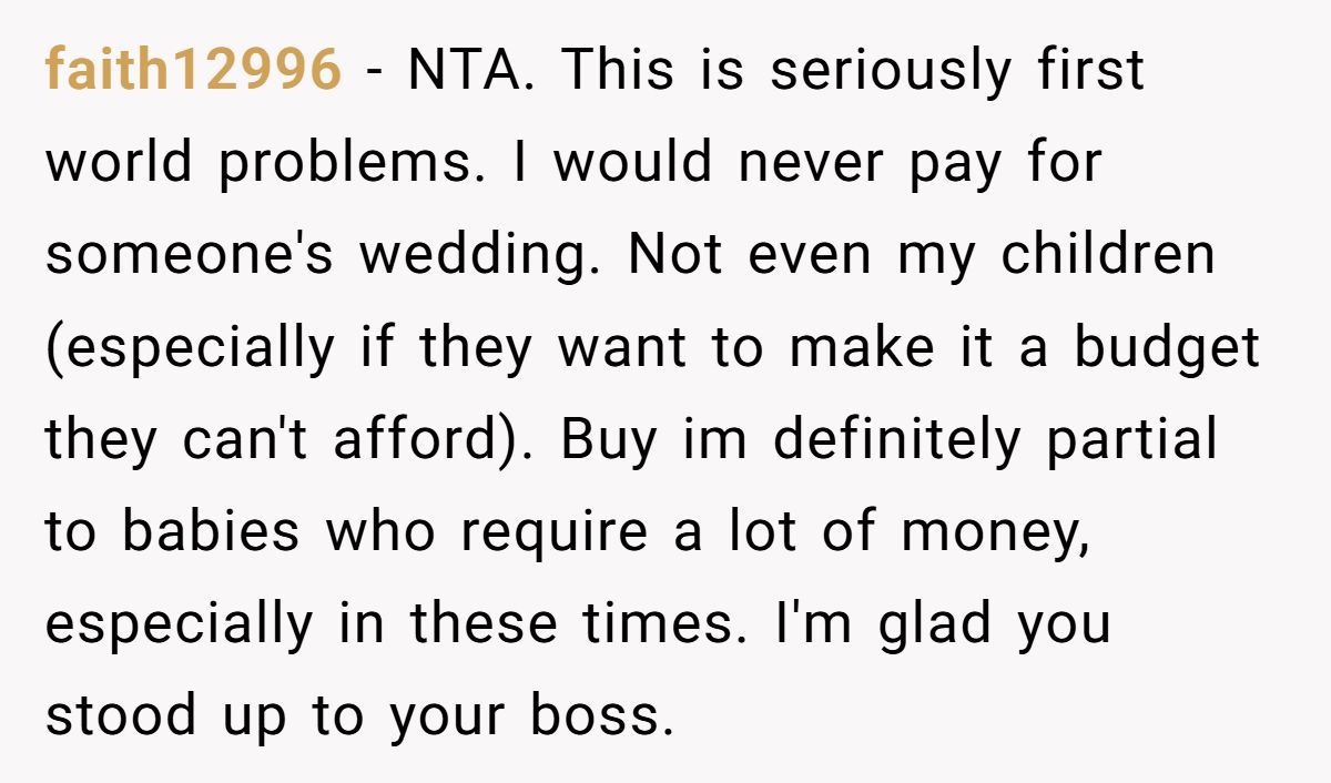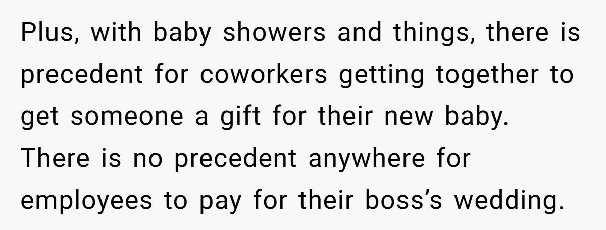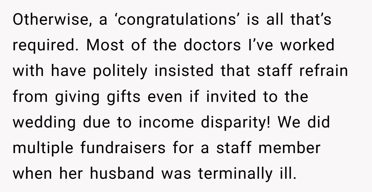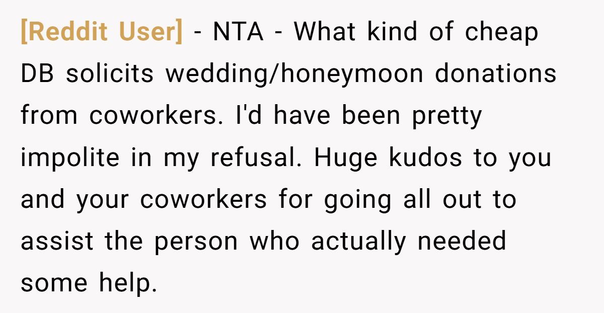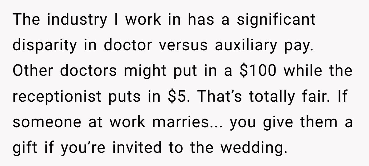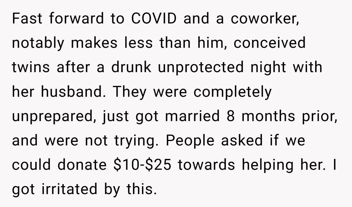 The twist? This guy made three times what most of the team earned. So when one woman politely declined, the office followed suit—and the wedding “gift fund” tanked. Flash forward to the pandemic: a lower-paid coworker, unexpectedly pregnant with twins, received overwhelming support from the same team.