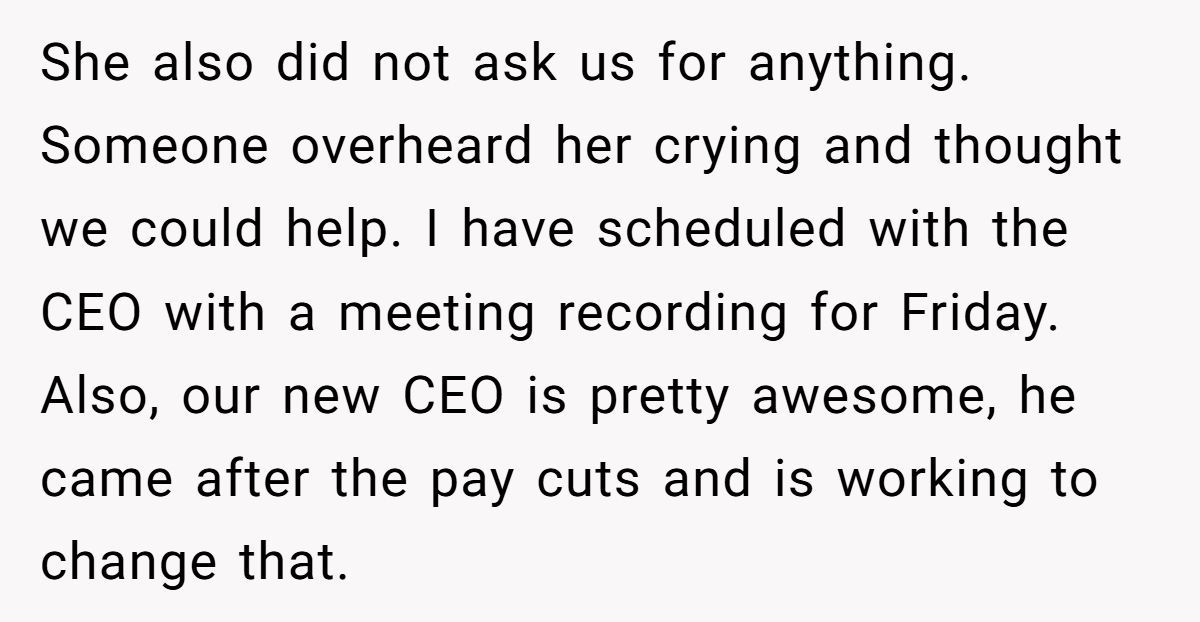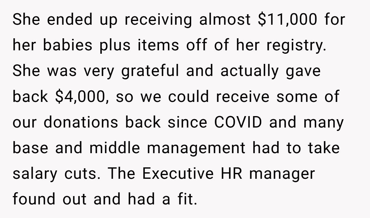 The pregnant coworker didn’t ask. She didn’t expect. Her life got turned upside down. And what did she do when help arrived? She returned $4,000 voluntarily to coworkers facing salary cuts. That’s the opposite of entitlement.