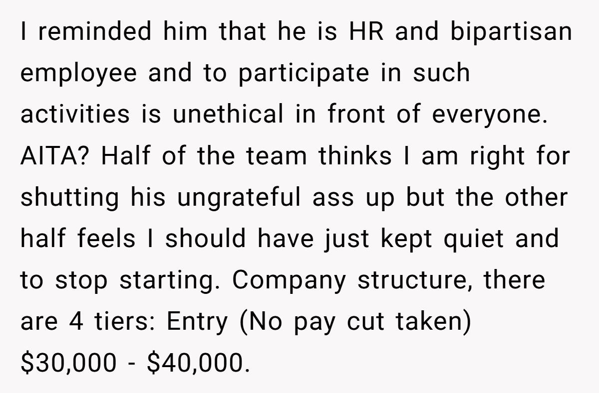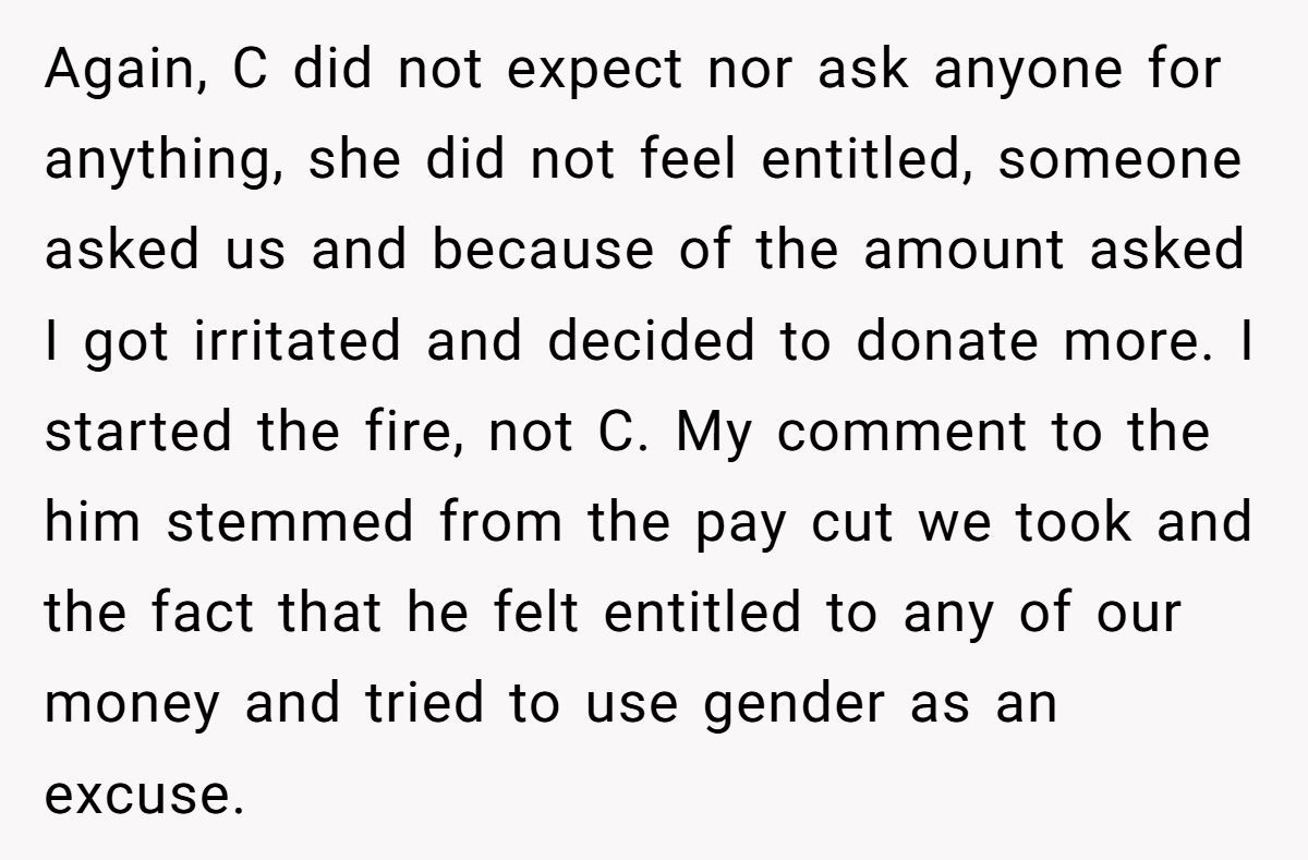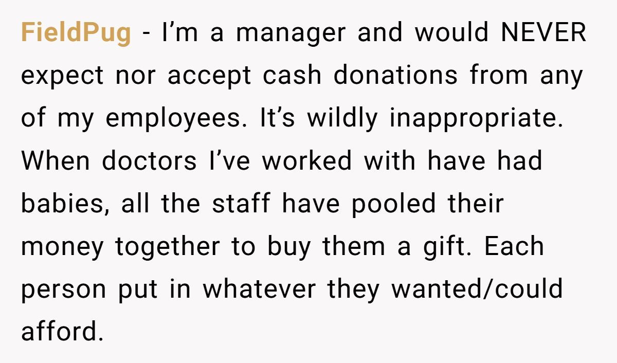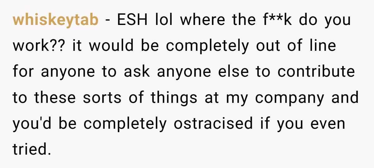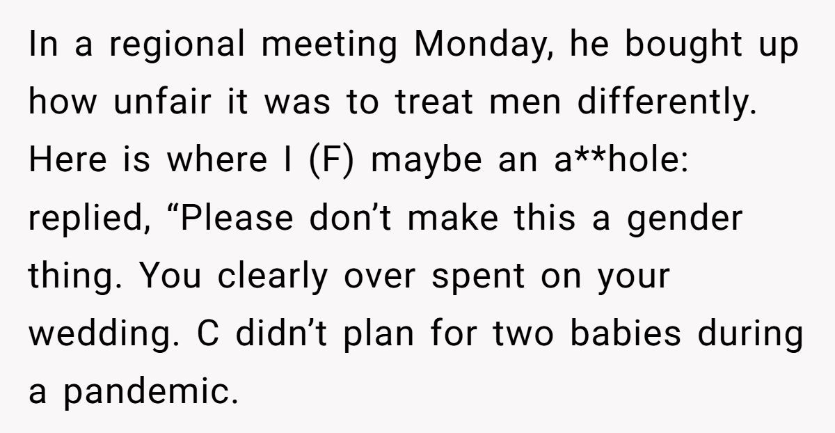 Workplace generosity should never be demanded, especially by those who already have more than enough. This wasn’t about gender—it was about need, respect, and basic decency. So, was the HR manager out of line? Absolutely. But did OP go too far calling him out publicly? That’s where the debate gets spicy.