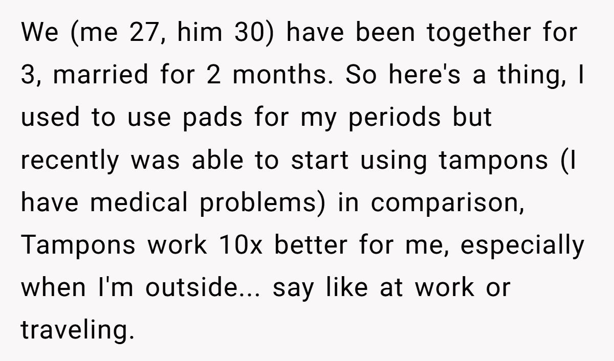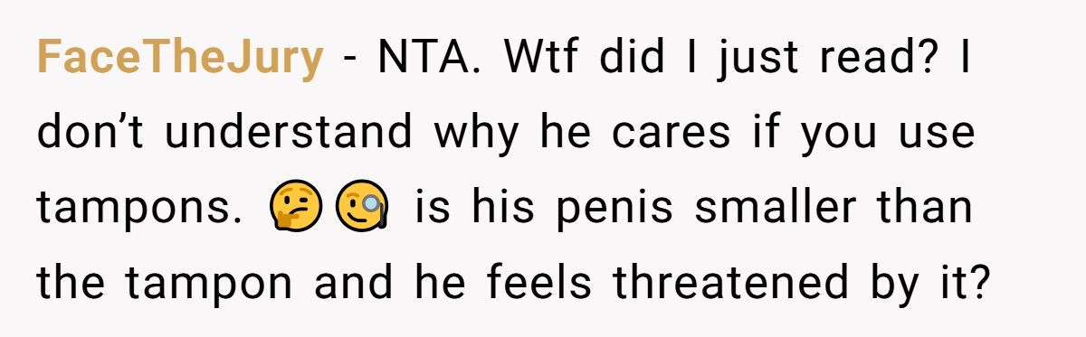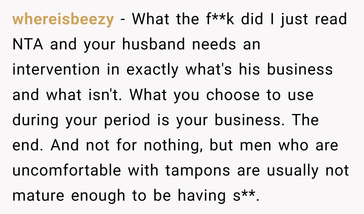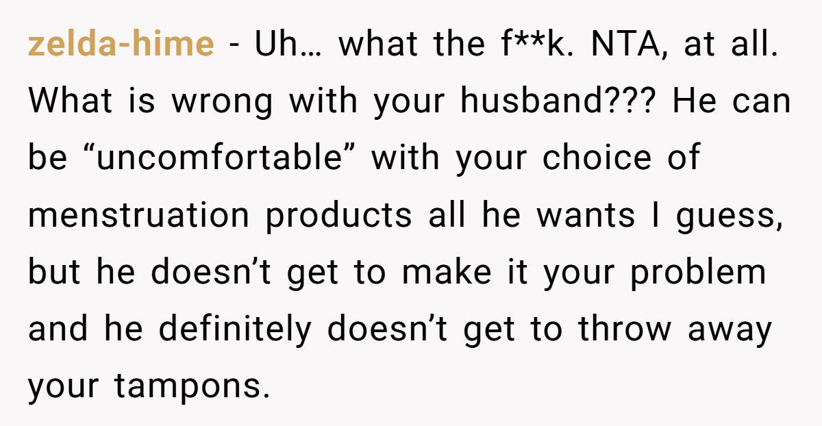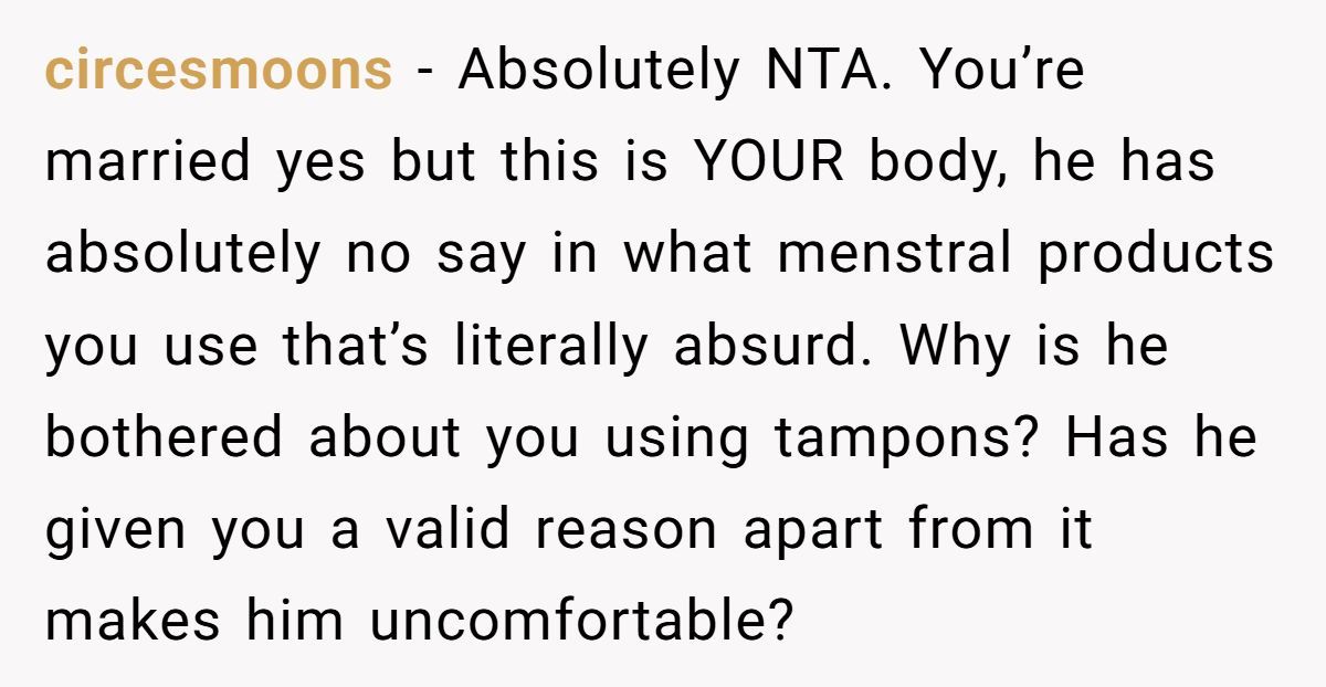 These Redditors defended OP’s right to use tampons, mocking the husband’s discomfort as irrational and intrusive