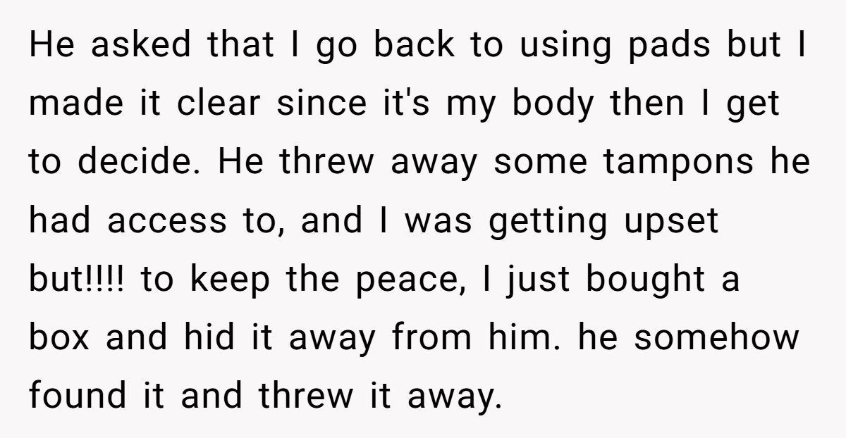 In this case, the husband didn’t just express discomfort. He escalated into policing his wife’s body—repeatedly discarding her personal products and then flipping the blame back onto her when she finally snapped. That isn’t just about tampons anymore—it’s about power, autonomy, and an unspoken gender imbalance.