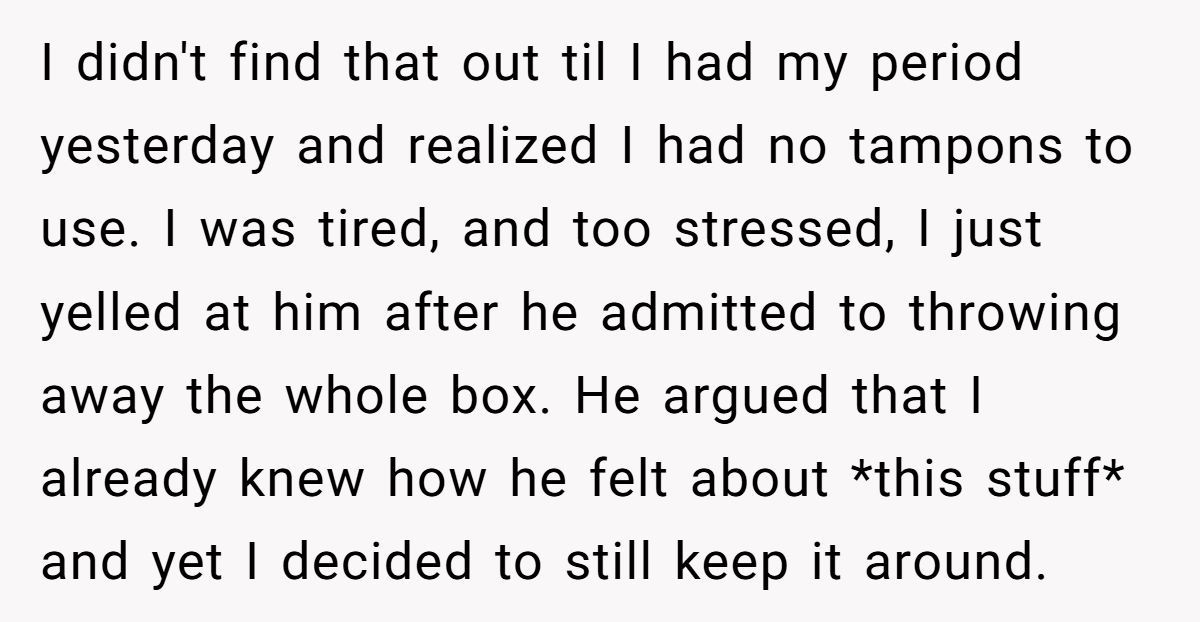 One Reddit user faced that exact nightmare. She thought she’d found relief from painful periods by switching to tampons—only for her husband to secretly toss them in the trash. Twice.