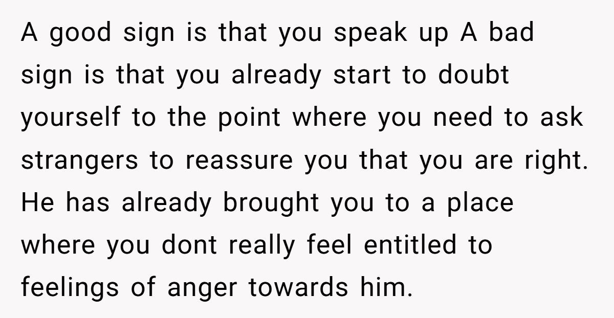 In this marriage, the husband positioned his feelings above his wife’s bodily needs—and expected her to apologize for resisting that hierarchy. That kind of dynamic, over time, can deeply erode someone’s self-worth.