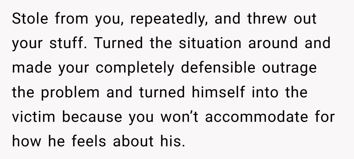 What stands out most here isn’t a simple difference in preference—it’s the emotional tactics used. Throwing away someone’s belongings and then calling their boundary-setting “verbal abuse” is a textbook example of gaslighting. The psychological term refers to manipulating someone into doubting their own feelings or version of events. As licensed therapist Shannon Thomas, author of Healing from Hidden Abuse, explains: