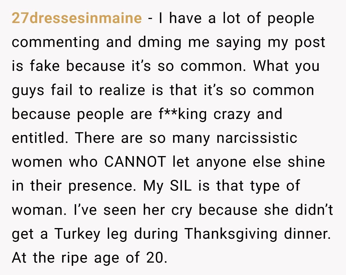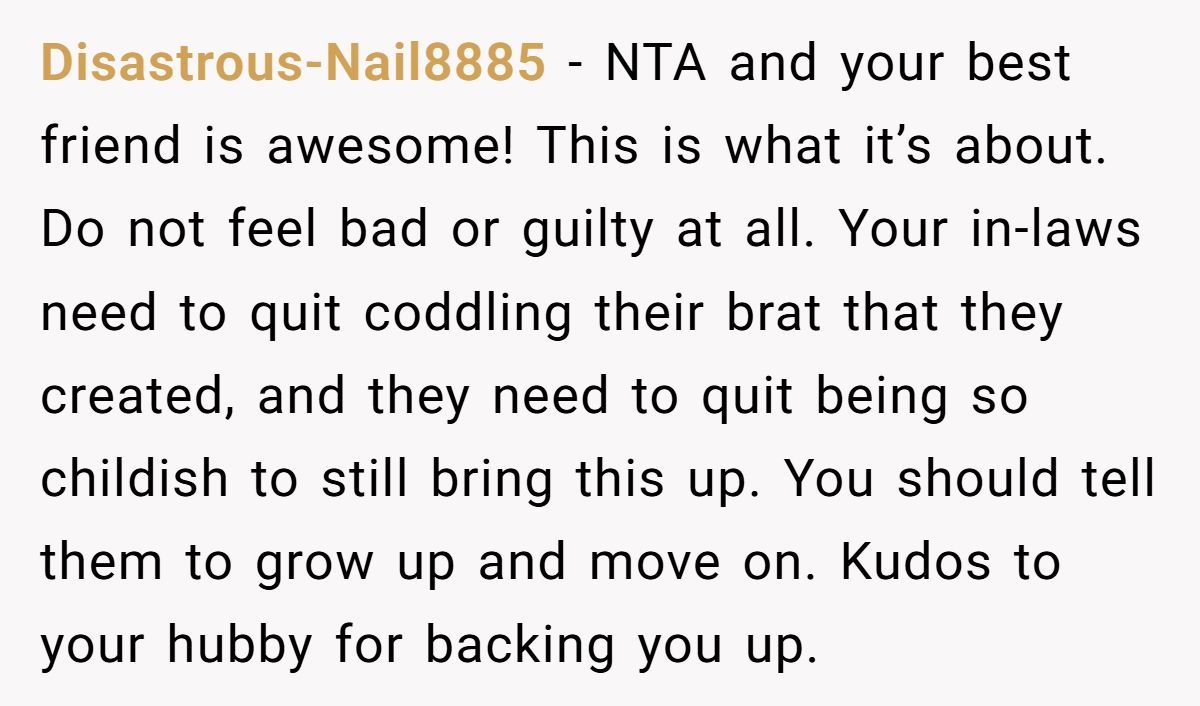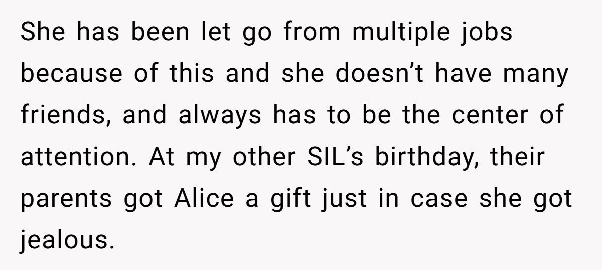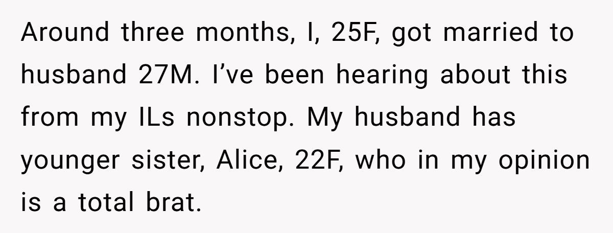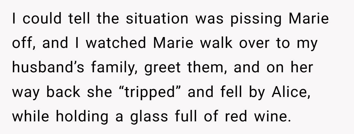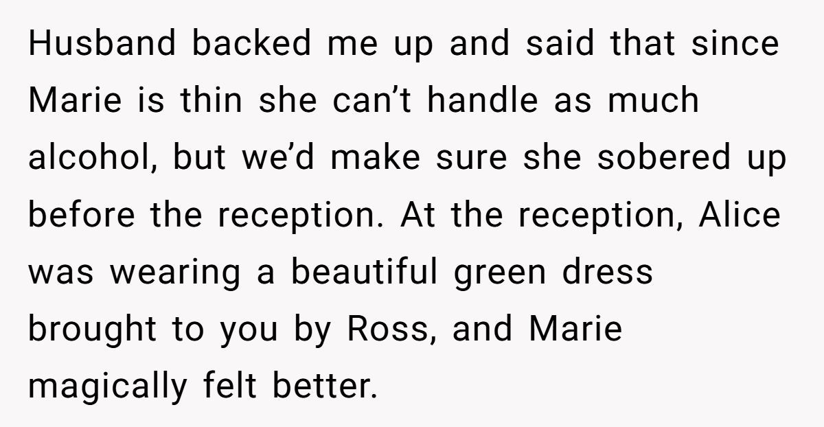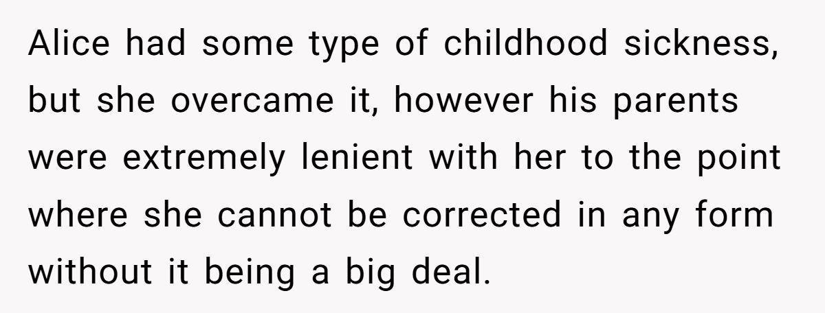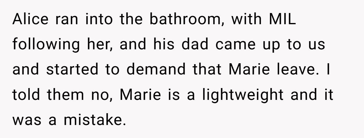 While the in-laws’ outrage might be understandable from a parental perspective, it reveals a deeper issue: enabling. Alice has a history of being coddled, indulged, and excused, which sets the stage for this very kind of behavior. The real surprise is not Marie’s act—it’s that the bride and groom didn’t just ask Alice to leave.