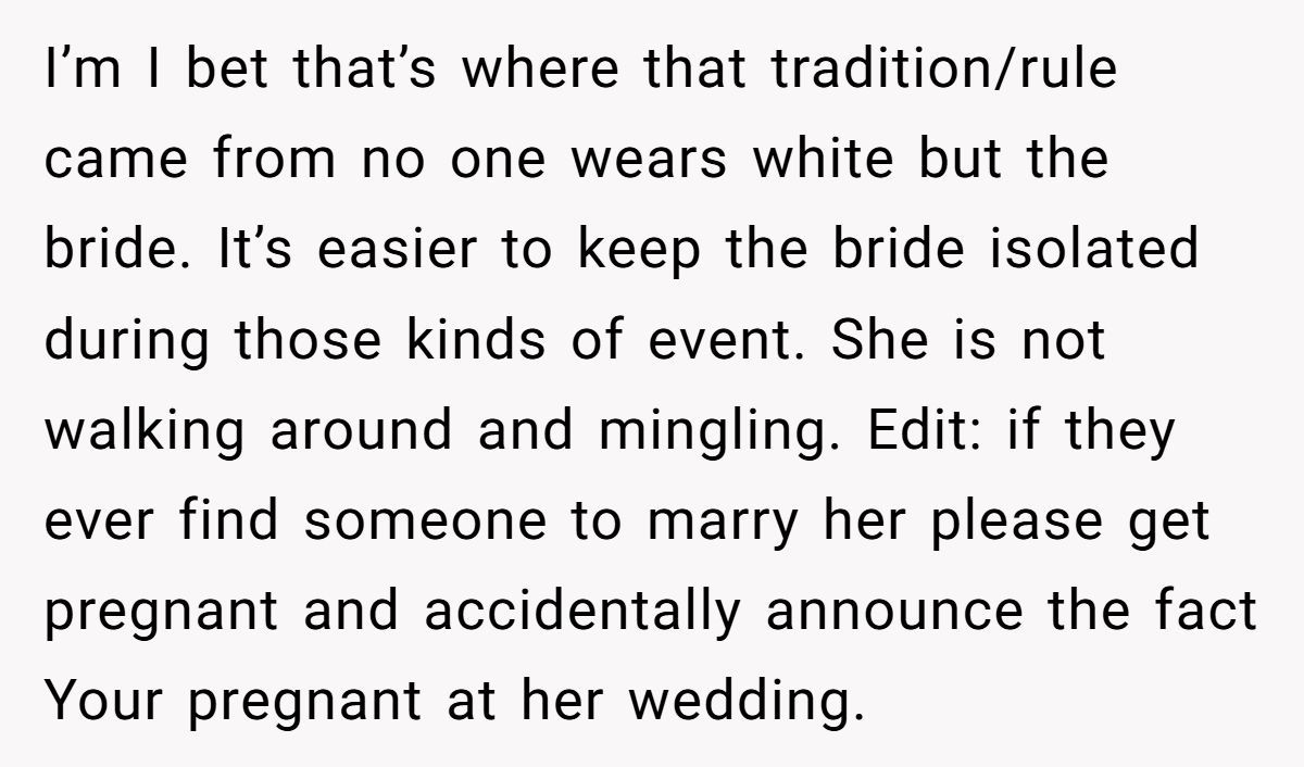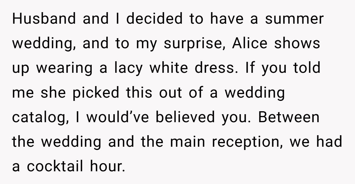 So when Alice strutted in wearing what could’ve passed for a bridal gown, it wasn’t just tacky—it was a power move. The comments from other guests (some mistaking her for the groom’s ex) prove that this wasn’t just the bride overreacting. The disruption was real.