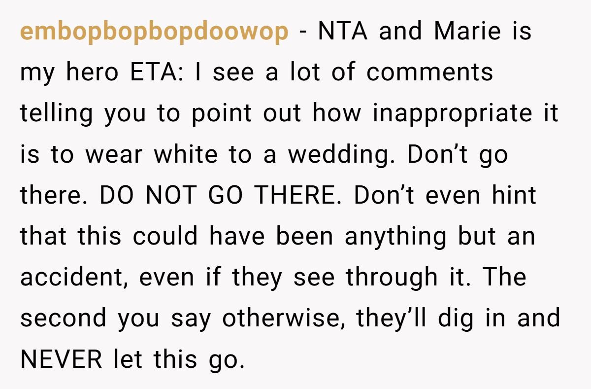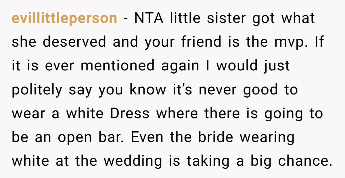 A Redditor shared a jaw-dropping moment from her wedding that’s got the internet choosing sides faster than you can say “I object.” Imagine this: your sister-in-law shows up in a lacy white dress to your wedding. She’s not the bride. Not even a bridesmaid. But she’s definitely ready to be the center of attention—until a loyal best friend with a glass of red wine and suspiciously clumsy footing turns the whole situation around.