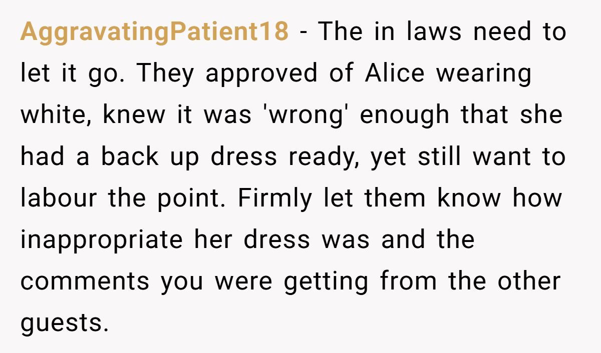 Commenters condemned Alice’s white dress as a deliberate attention-grab, noting her backup dress suggests she knew it was wrong