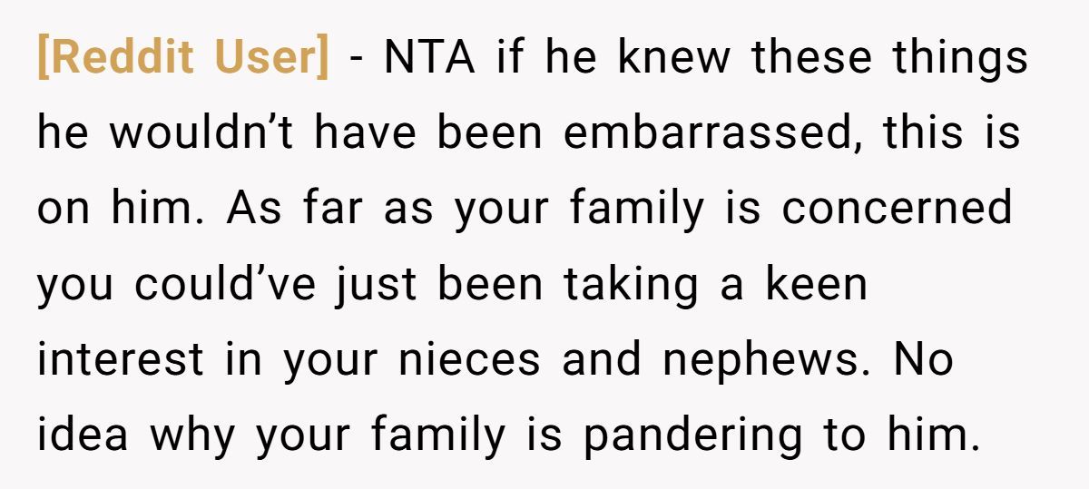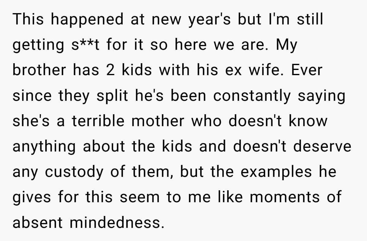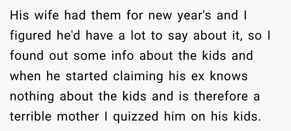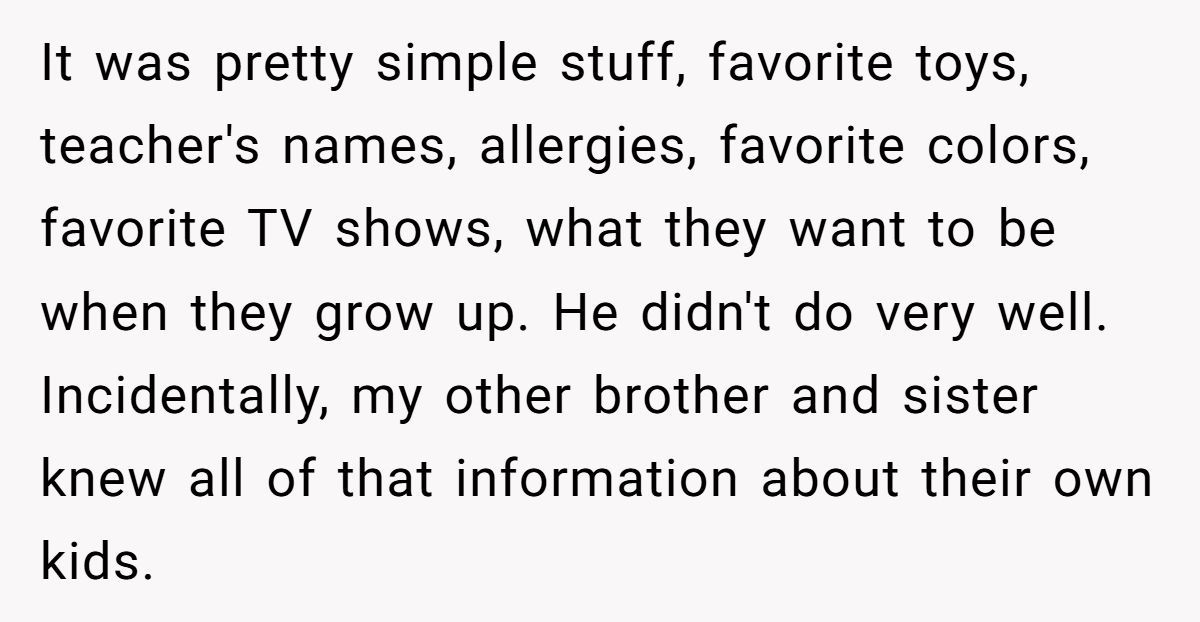 When his brother launched into another tirade on New Year’s Day, saying the ex had no clue about school names, favorite snacks, or bedtime rituals, Redditor decided to flip the script. He quizzed his brother—right in front of the whole family—on facts about his own kids. The result was… embarrassing. Want to know how many favorites he could recall? Keep reading.