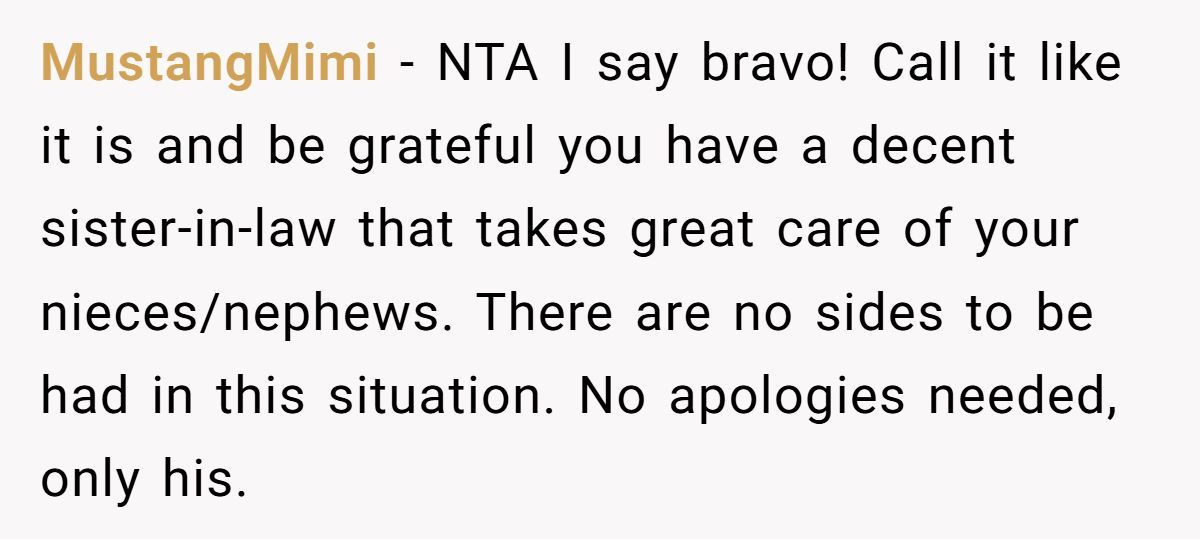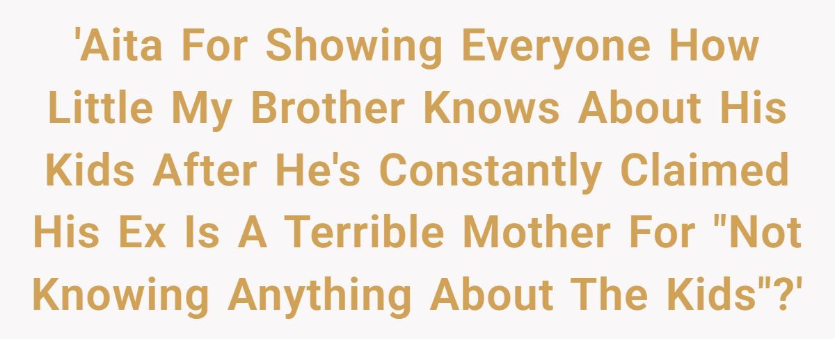 At the heart of this drama is a simple truth: parenting isn’t proven by loud declarations but by memory, presence, and emotional investment. Your brother can’t call someone a bad mother if he doesn’t know his own children’s birthdays, allergies, or favorite cartoons. Apologize? Likely not—unless he’s ready to actually do the parenting work he demands from her.