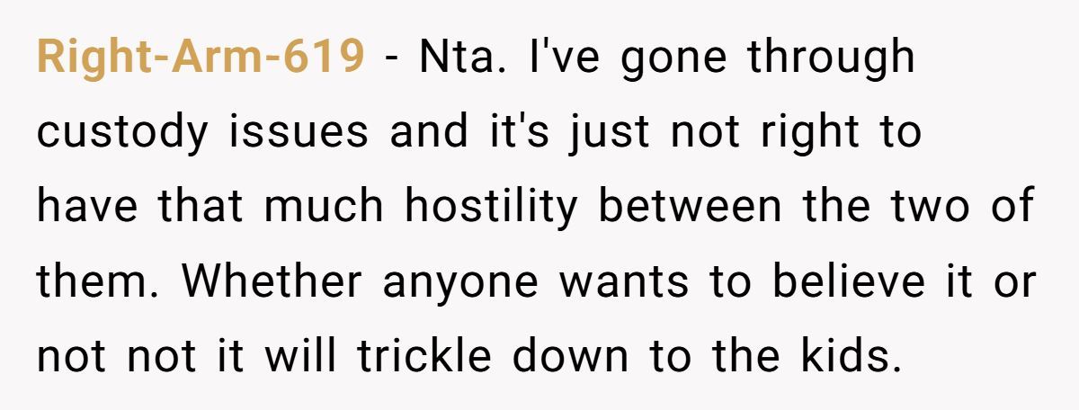 This Redditor supported OP but warned that ongoing parental hostility could harm the kids, urging a focus on their well-being