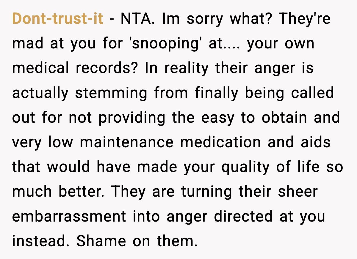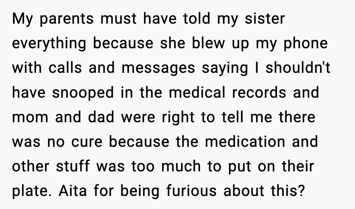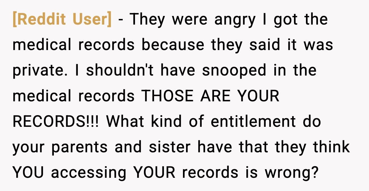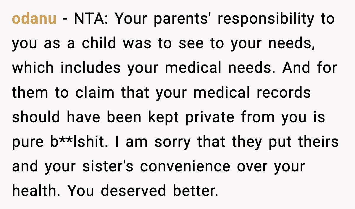 The parents’ outrage over her accessing her own medical records screams deflection—likely guilt for being called out. Open communication could’ve softened the blow, but their secrecy and the sister’s attacks only deepened the hurt. The Redditor might consider therapy to process this betrayal and set boundaries, perhaps limiting contact while she heals.