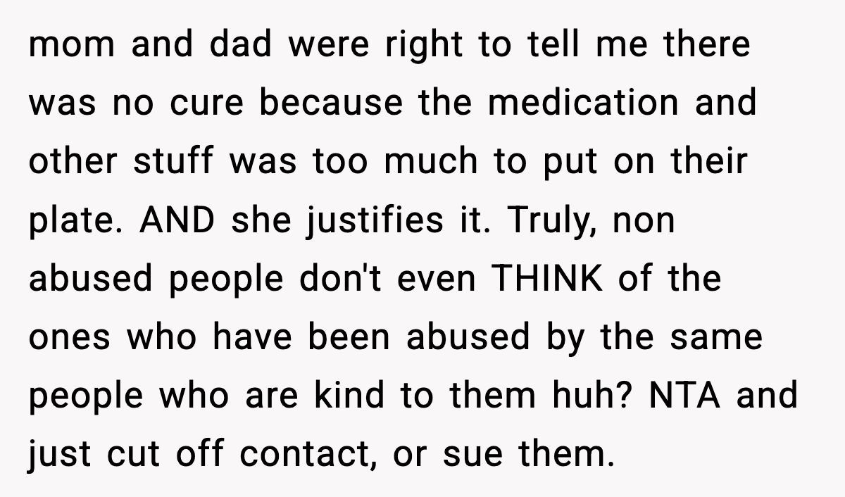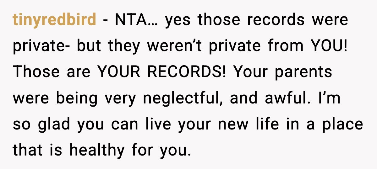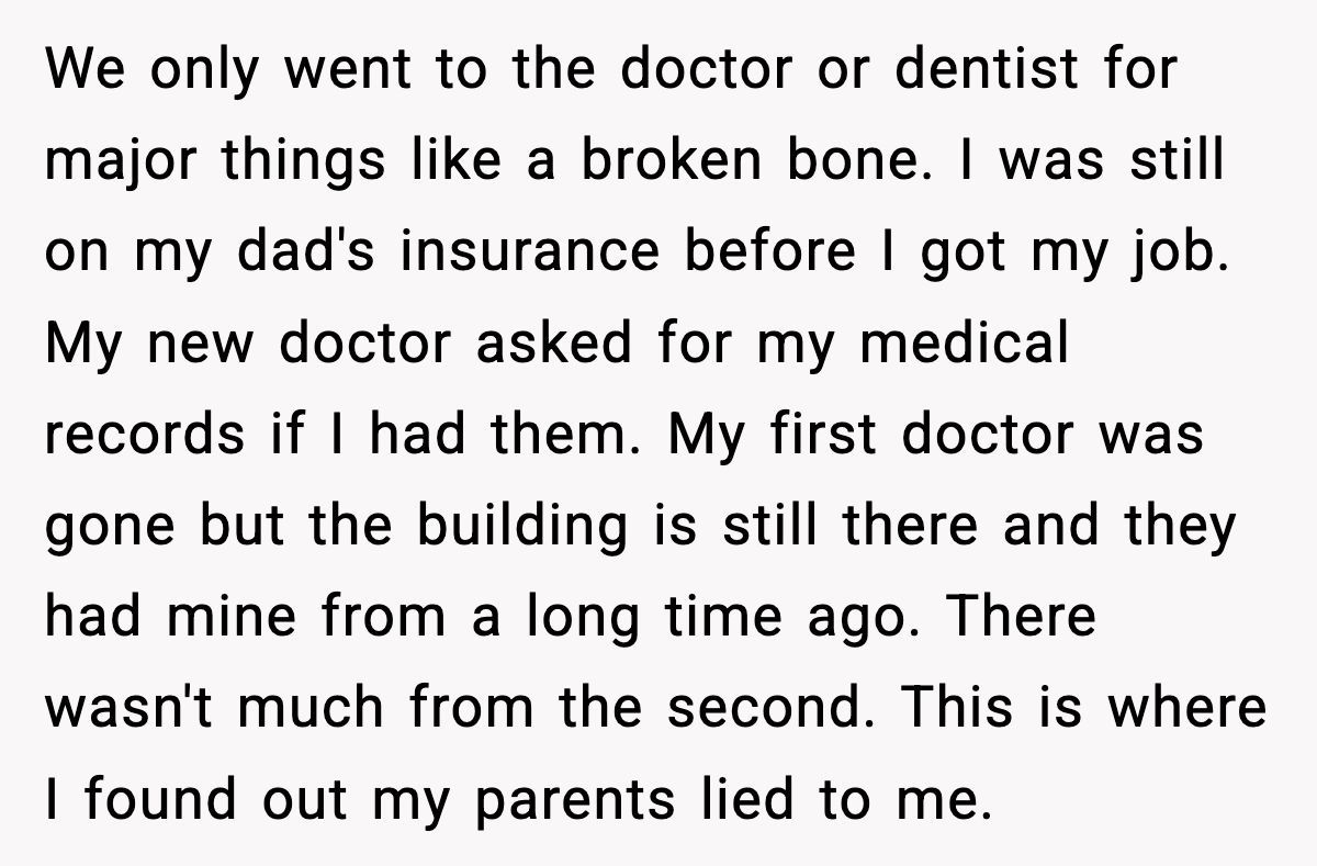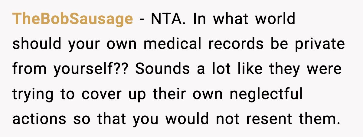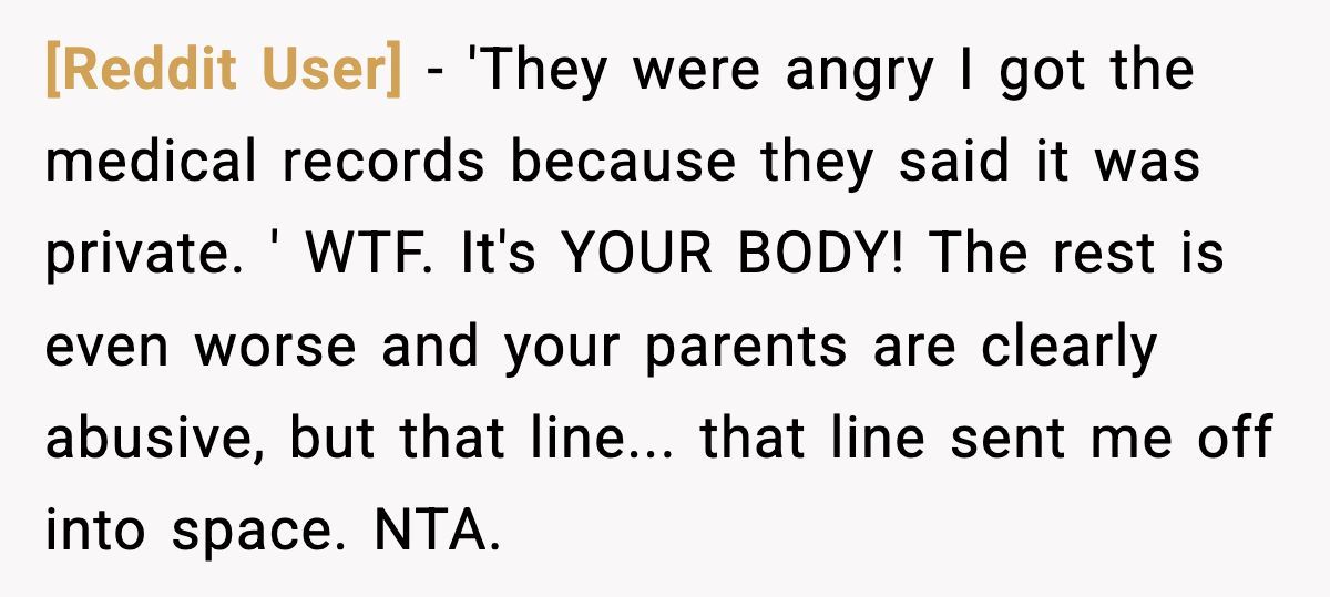 The parents’ outrage over her accessing her own medical records screams deflection—likely guilt for being called out. Open communication could’ve softened the blow, but their secrecy and the sister’s attacks only deepened the hurt. The Redditor might consider therapy to process this betrayal and set boundaries, perhaps limiting contact while she heals.