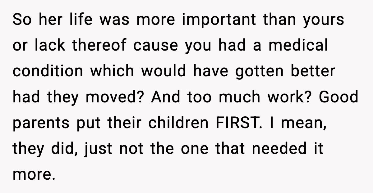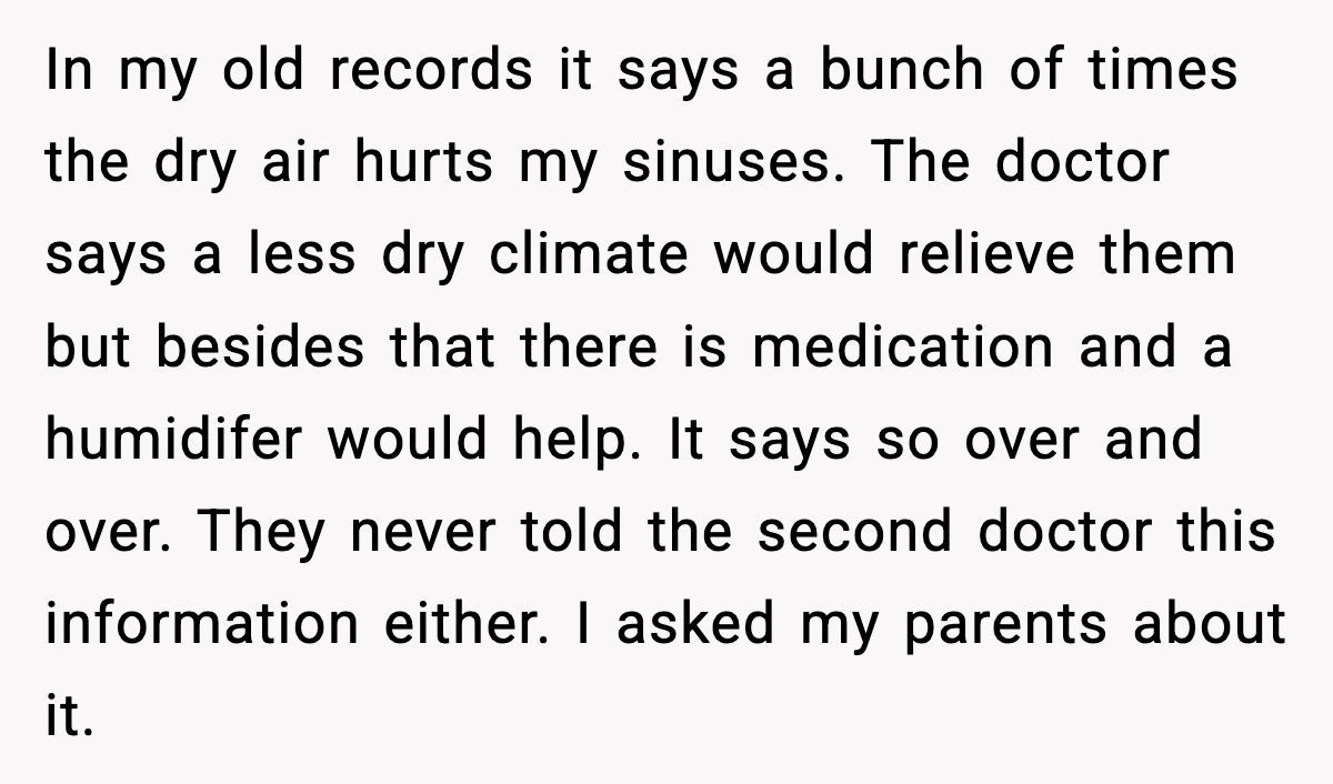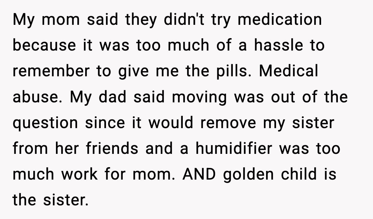 Family secrets can feel like a plot twist in a daytime drama, but this Redditor’s story hits like a bombshell. Her parents knew her debilitating sinus issues—constant snot, no smell or taste, and social isolation—could be helped with medication, a humidifier, or a less arid climate. Instead, they told her there was “no cure,” prioritizing their convenience and her sister’s social life over her well-being. It’s a gut-punch that raises questions about parental duty.