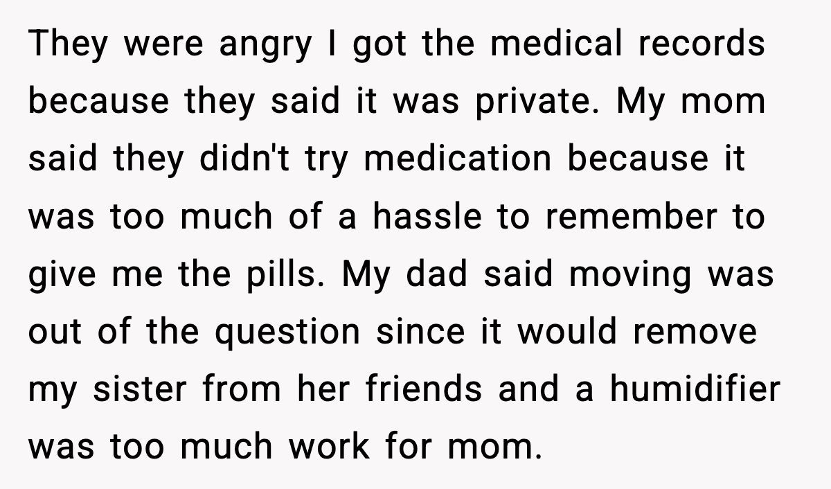 And when he confronted his parents? They were more upset about him reading his own records than they were about the years he lost to suffering. The kicker? A humidifier was “too much work,” and the pills were “too hard to remember.” Let’s break it down.