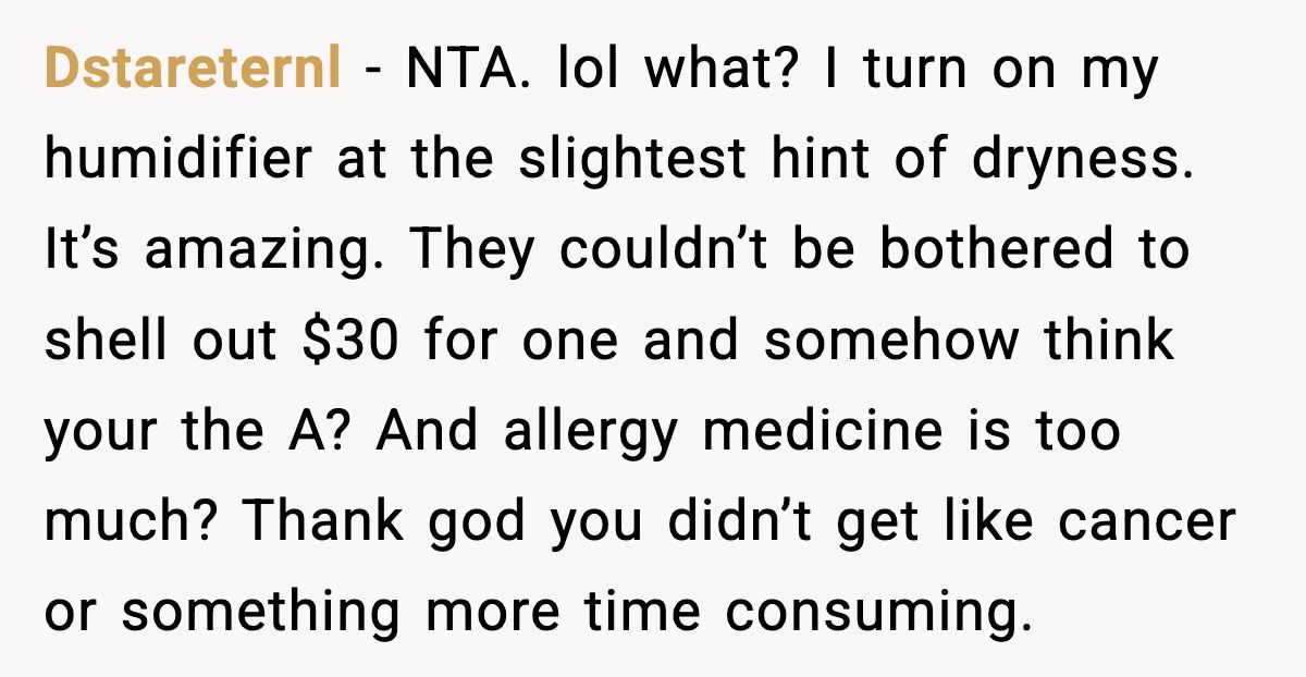 From the parents’ perspective, daily medication or a humidifier might’ve seemed like extra chores in a busy household. Moving to a humid climate? That’s a big ask, especially with another child’s needs in play. But dismissing accessible solutions like a $30 humidifier or allergy pills feels indefensible. The sister’s fierce defense, claiming it was “too much” for their parents, hints at a family dynamic where one child’s comfort trumped another’s health.