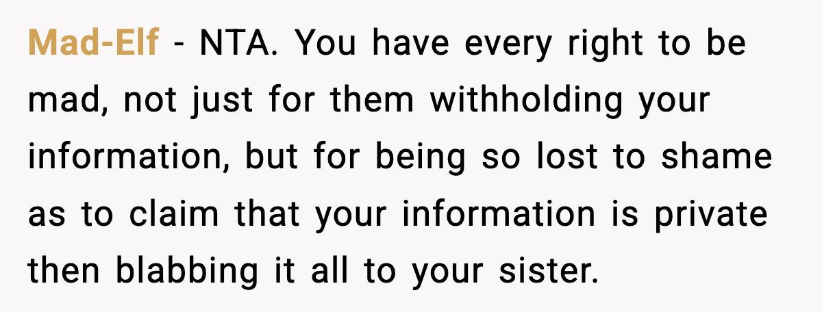 One commenter slammed the parents’ lack of shame, sharing her info with her sister but not her