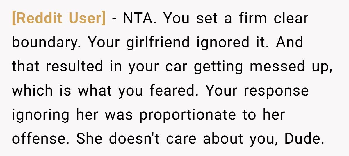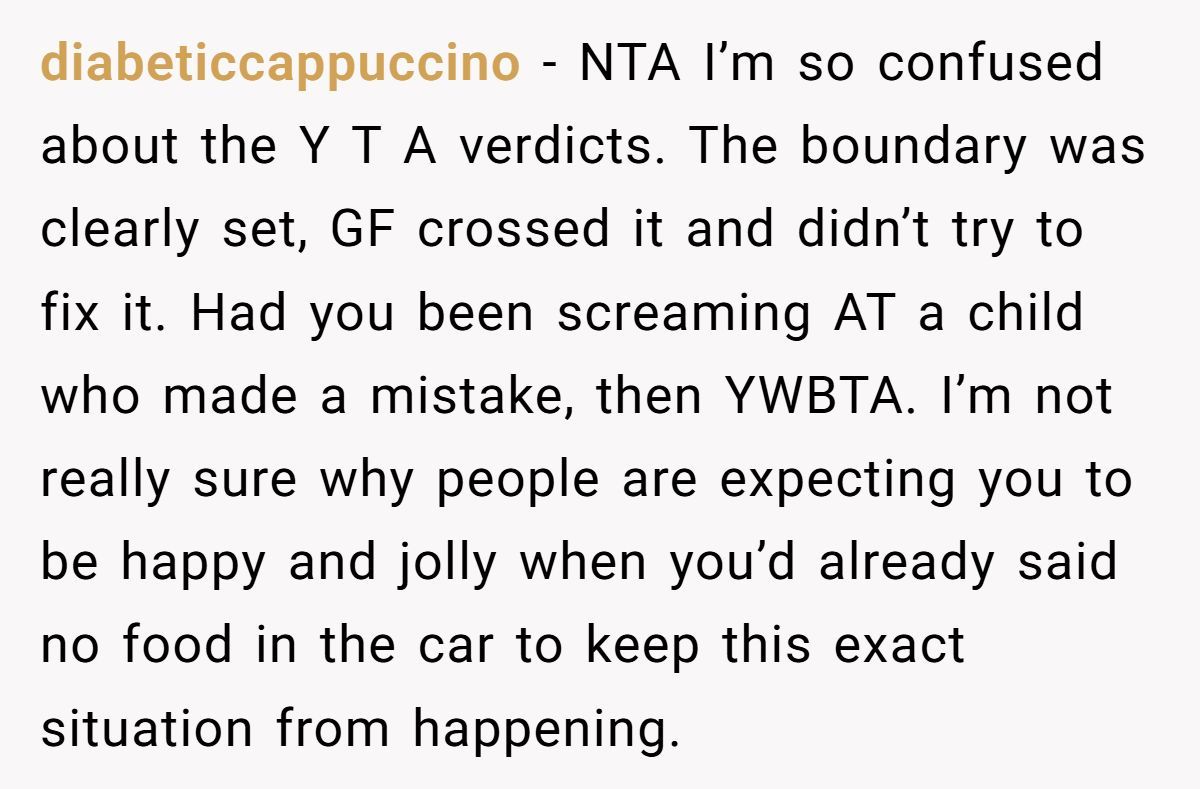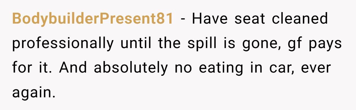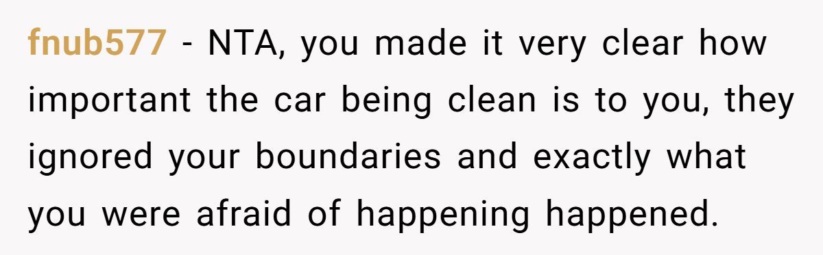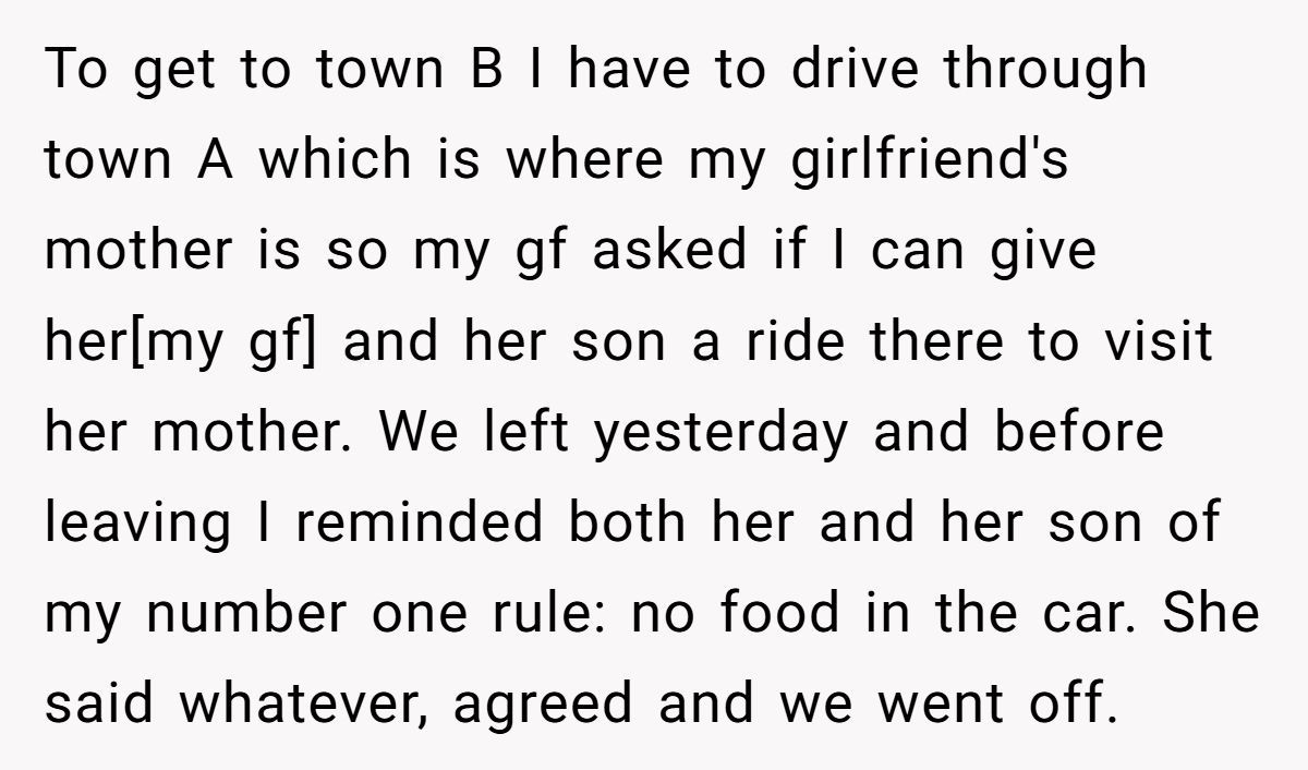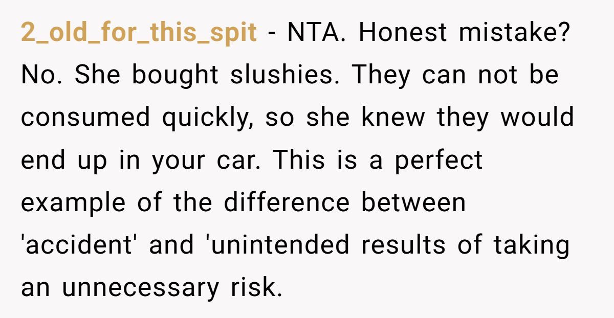 This Redditor made his expectations crystal clear: no food or drink in his car. And not for fun—because it was new, meaningful, and one of the few expensive things he’s treated himself to. When someone loves their car, they’re not just being picky—they’re protecting something they’ve worked hard for. But when his girlfriend not only brought slushies but brushed off his concern, it crossed from “oops” to disrespect.