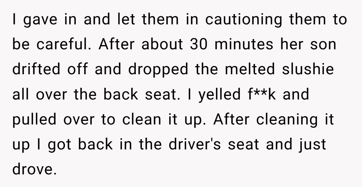 One Redditor made a simple request: don’t bring food or drinks into his car. But when his girlfriend showed up with slushies for both her and her son, things quickly spiraled from sticky to silent. After the inevitable spill happened—despite his warnings—he kept his cool… by going totally silent.