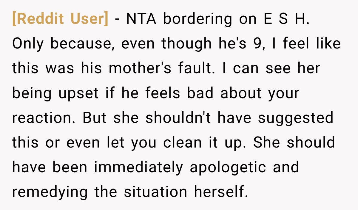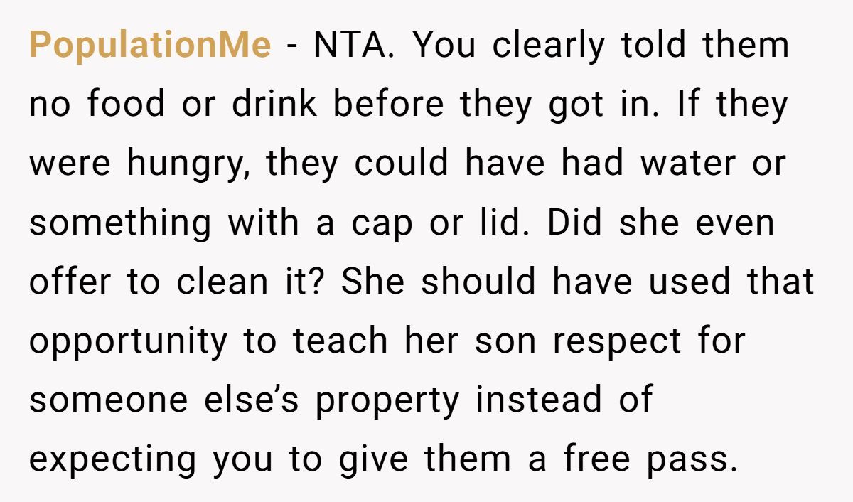 Commenters saw the spill as the mother’s fault for allowing drinks, not the son’s, though one noted his feelings deserved consideration