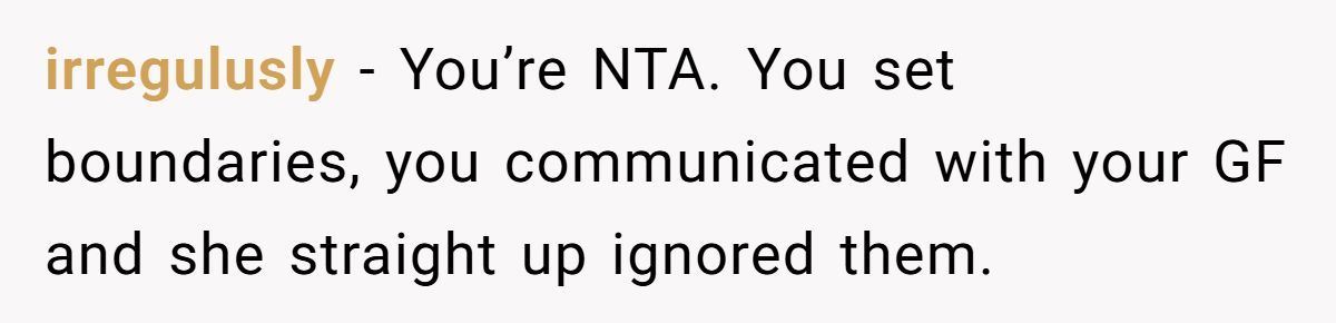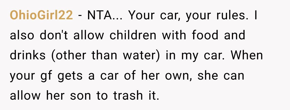 Commenters supported his clear “no food” rule, calling the girlfriend’s decision to bring slushies disrespectful and the cause of the spill