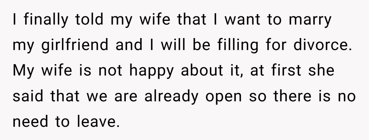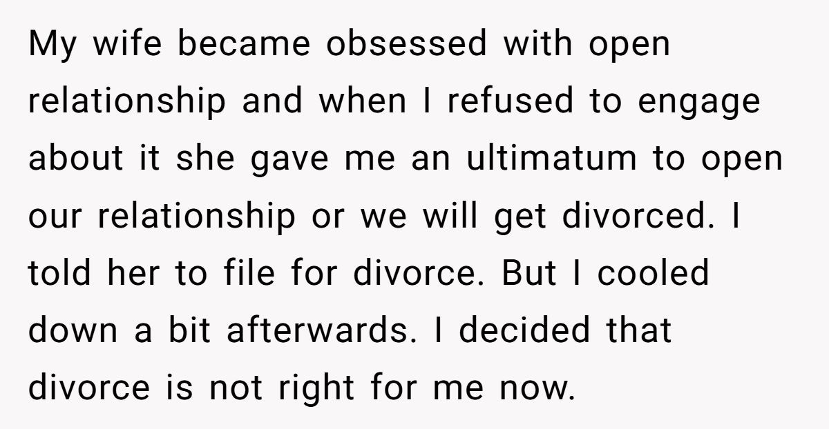 This story isn’t about an open marriage—it’s about a closed loop of resentment and miscommunication. One person bluffed. The other played the long game. Now both are reeling from the fallout. Is the husband heartless or just honest about what he wants? Did the wife expect too much freedom without consequence?