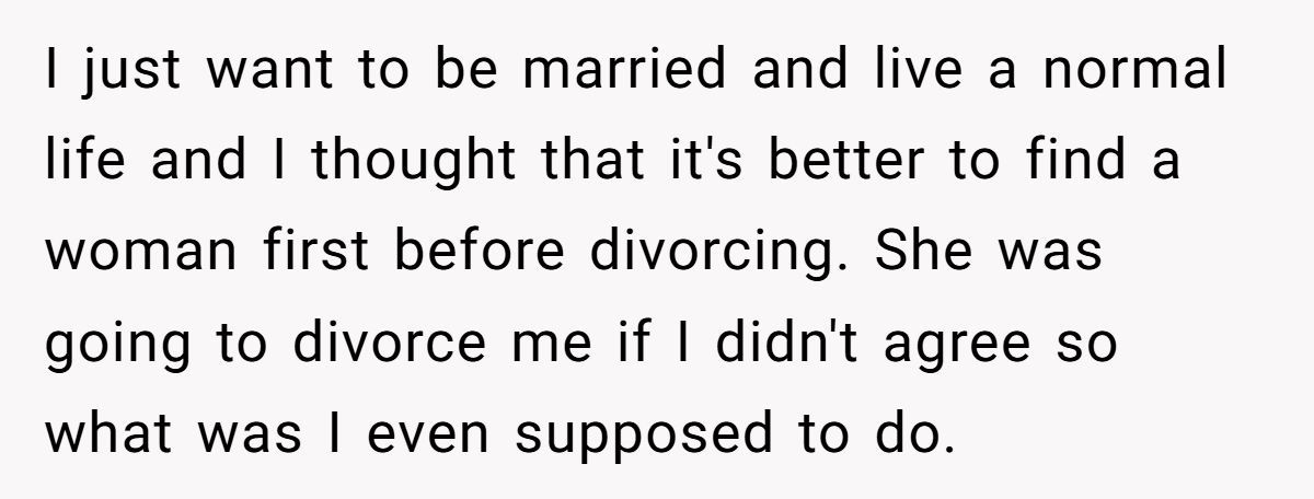 After two years of simmering resentment and pretending things were okay, he emerged with a new plan—and a new fiancée. But now that he’s ready to finalize the divorce, his wife claims she never meant the ultimatum in the first place.