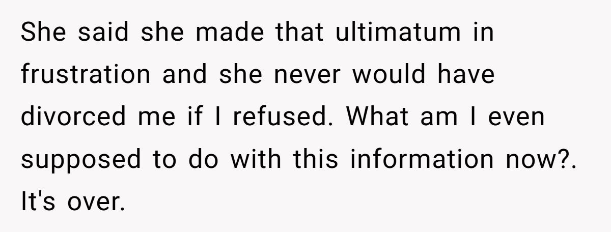 Marriage ultimatums rarely end well—especially when they’re not meant to be taken seriously. This Redditor’s situation is a perfect storm of emotional immaturity, miscommunication, and unchecked ego. He didn’t just respond to the ultimatum—he acted on it. And now his wife is stunned that he followed through.