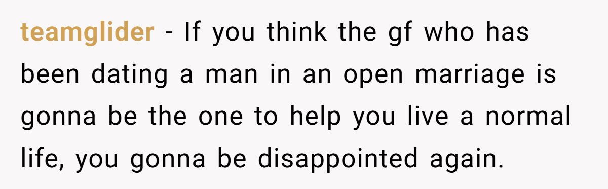 Still, the bigger issue here is the myth of reversibility. Once an ultimatum like “open our marriage or else” is dropped, the emotional damage is real—regardless of whether the speaker “meant it.” Communication breakdowns like this destroy trust on both sides. When partners stop speaking clearly and honestly, resentment festers into a quiet plan B.