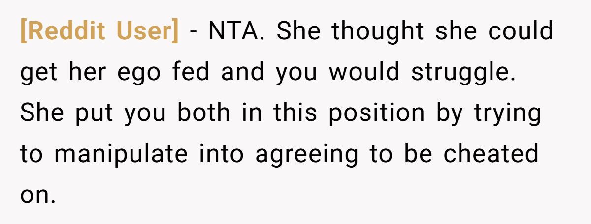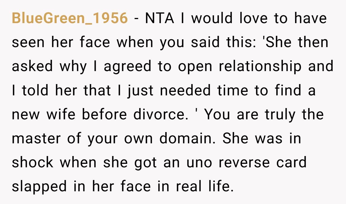 In this case, the wife weaponized the threat of divorce to pressure her husband into an arrangement she wanted. But when he complied—and then moved on—she recoiled. It reveals a pattern of control masked as frustration. According to relationship expert Esther Perel, “When couples use open relationships to fix deep-seated issues, they’re often chasing novelty to escape emotional responsibility.”