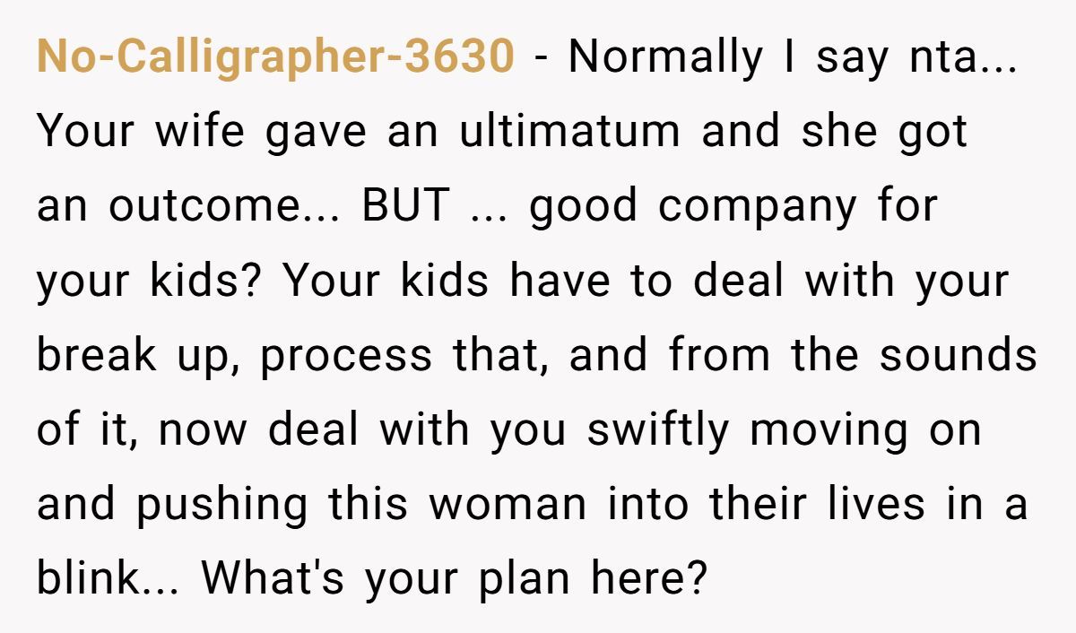 Some commenters questioned the Redditor’s new marriage plan, raising concerns about his motives and kids