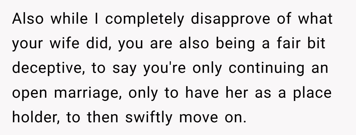Let’s not pretend the husband is guilt-free, though. Continuing in an “open” marriage purely to shop for a new partner without telling your spouse is deceptive, no matter how wronged you feel. Reddit users were quick to call him out on the emotional ambush—especially involving kids. Blindsiding a family with a surprise new “wife” does not scream emotional maturity.