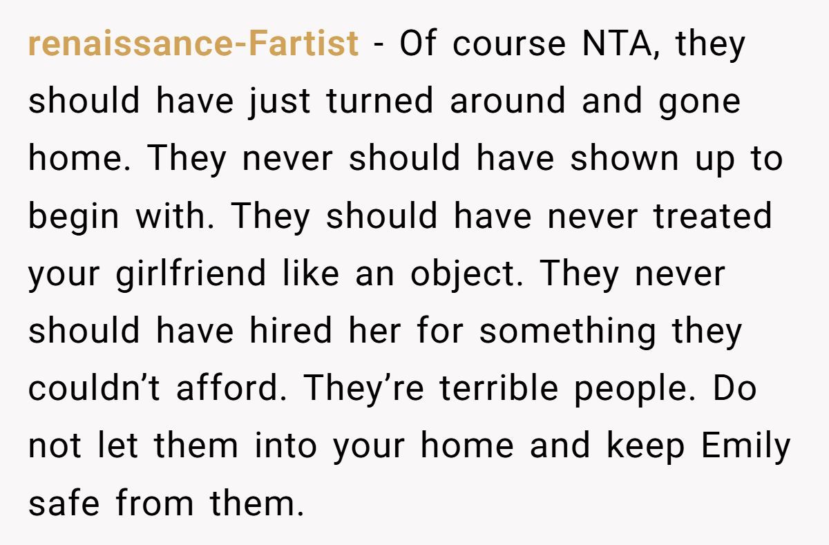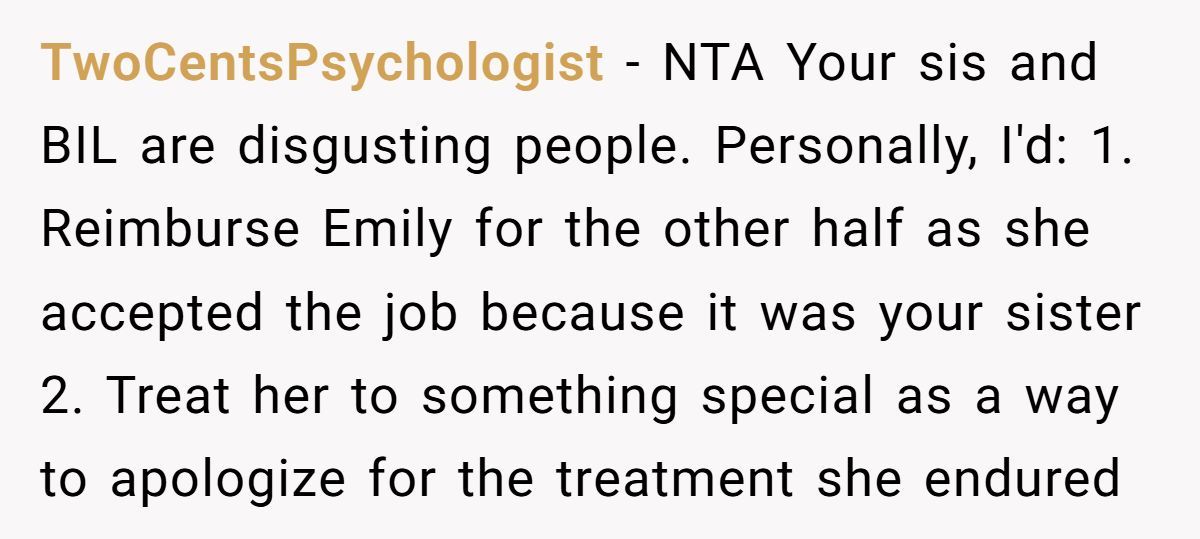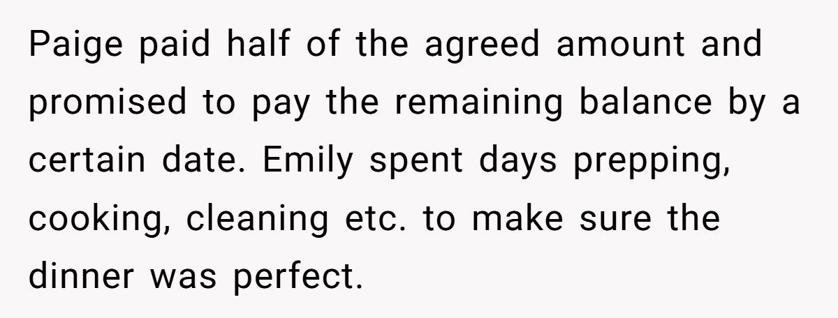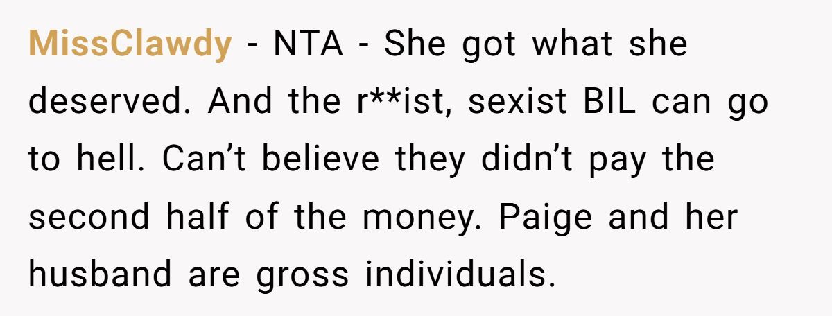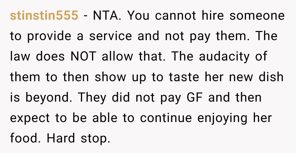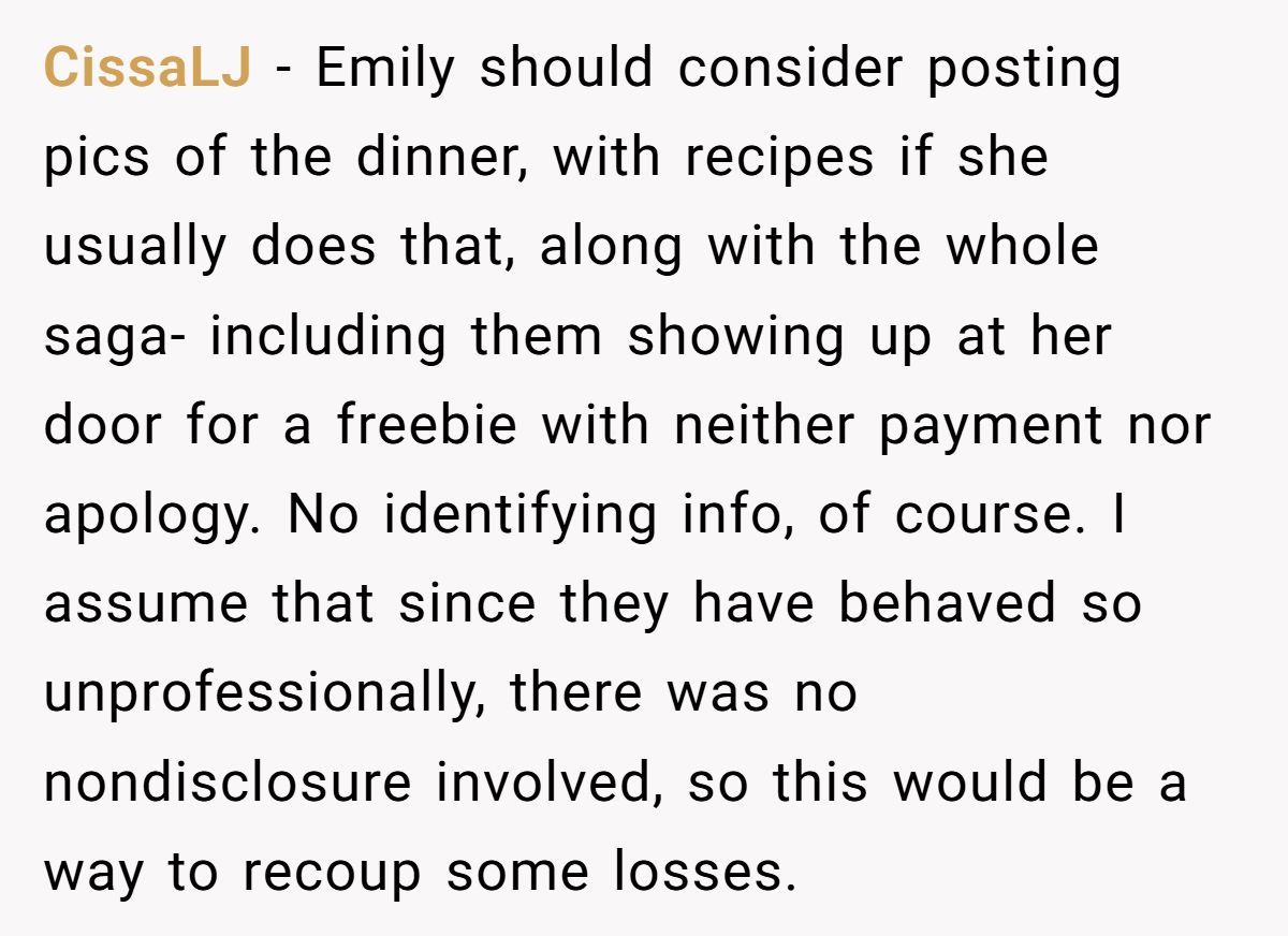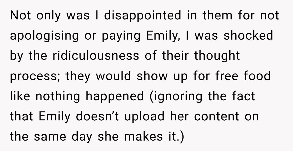 Commenters called Paige and her husband’s actions “gross,” condemning their refusal to pay Emily and their audacity to demand free food