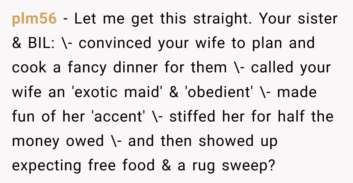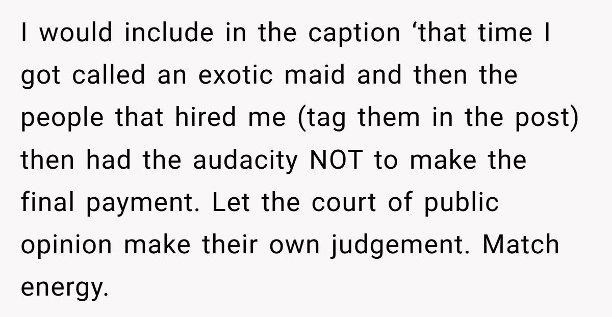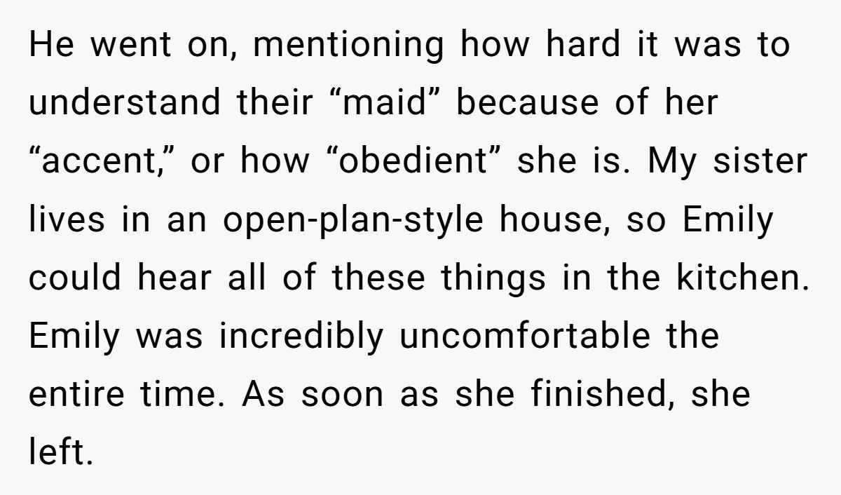 Emily wasn’t just unpaid—she was dehumanized. Being referred to as an “obedient maid” with an “accent” crosses the line from ignorant to offensive. These aren’t harmless remarks; they’re microaggressions that reinforce harmful racial stereotypes. It’s textbook gaslighting to ignore the hurt, then show up expecting free food as if the slate’s clean.