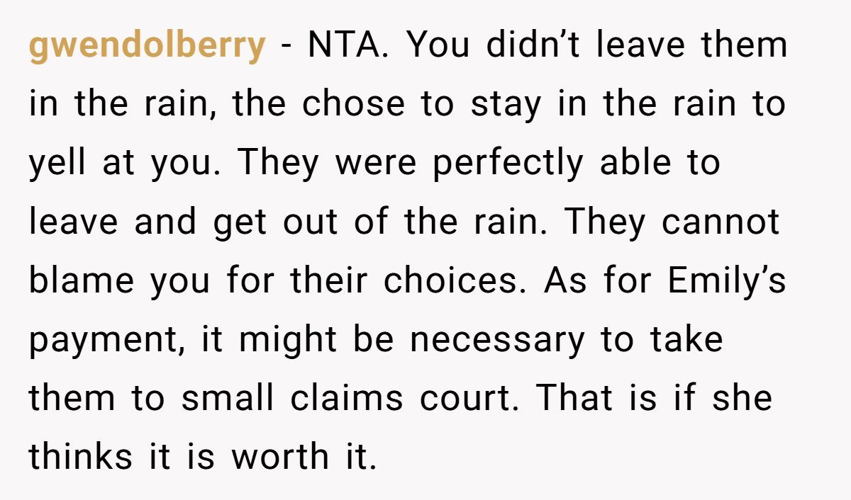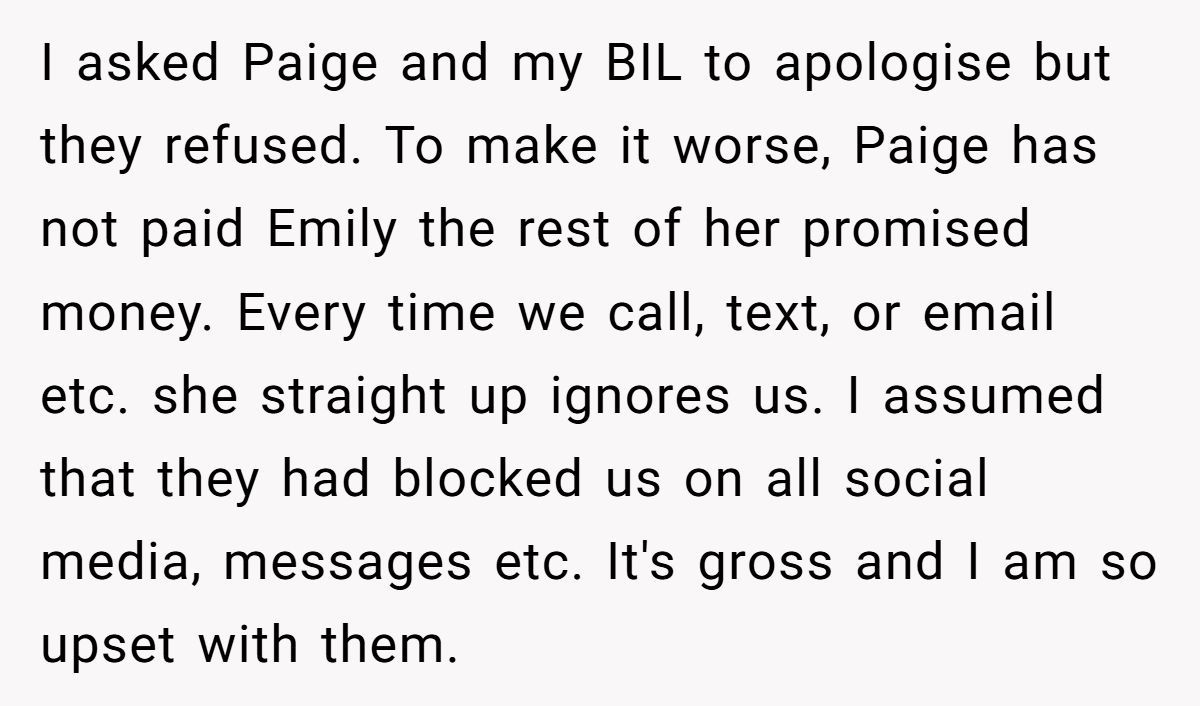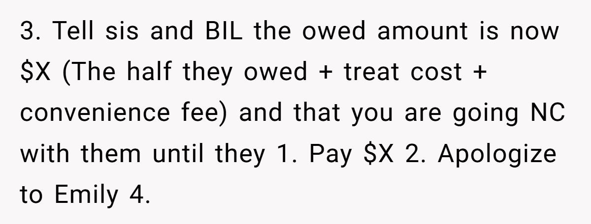 Commenters suggested Emily file in small claims court for the unpaid amount, urging the Redditor to cut contact until payment and an apology are made