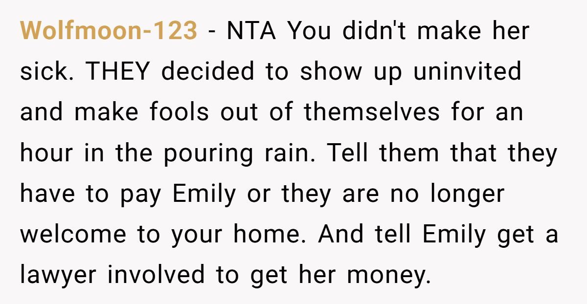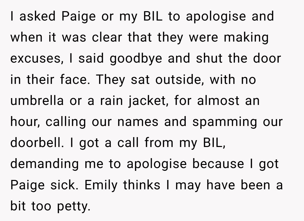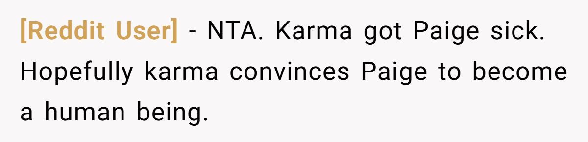Users noted they chose to stay in the rain, not the Redditor’s fault, and saw Paige’s illness as karma for her behavior