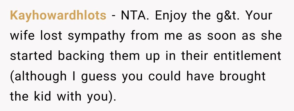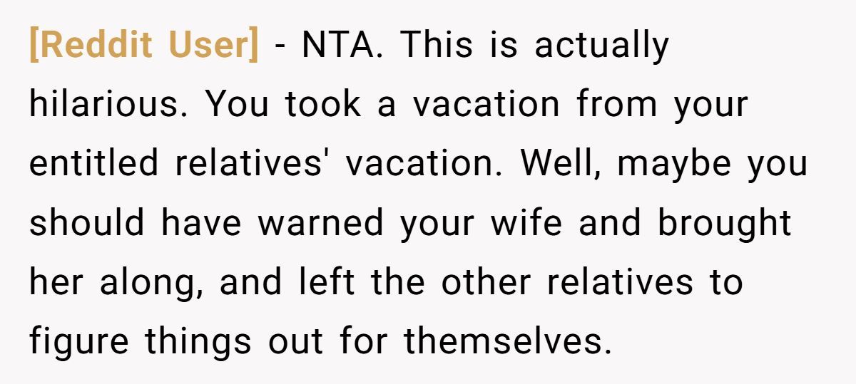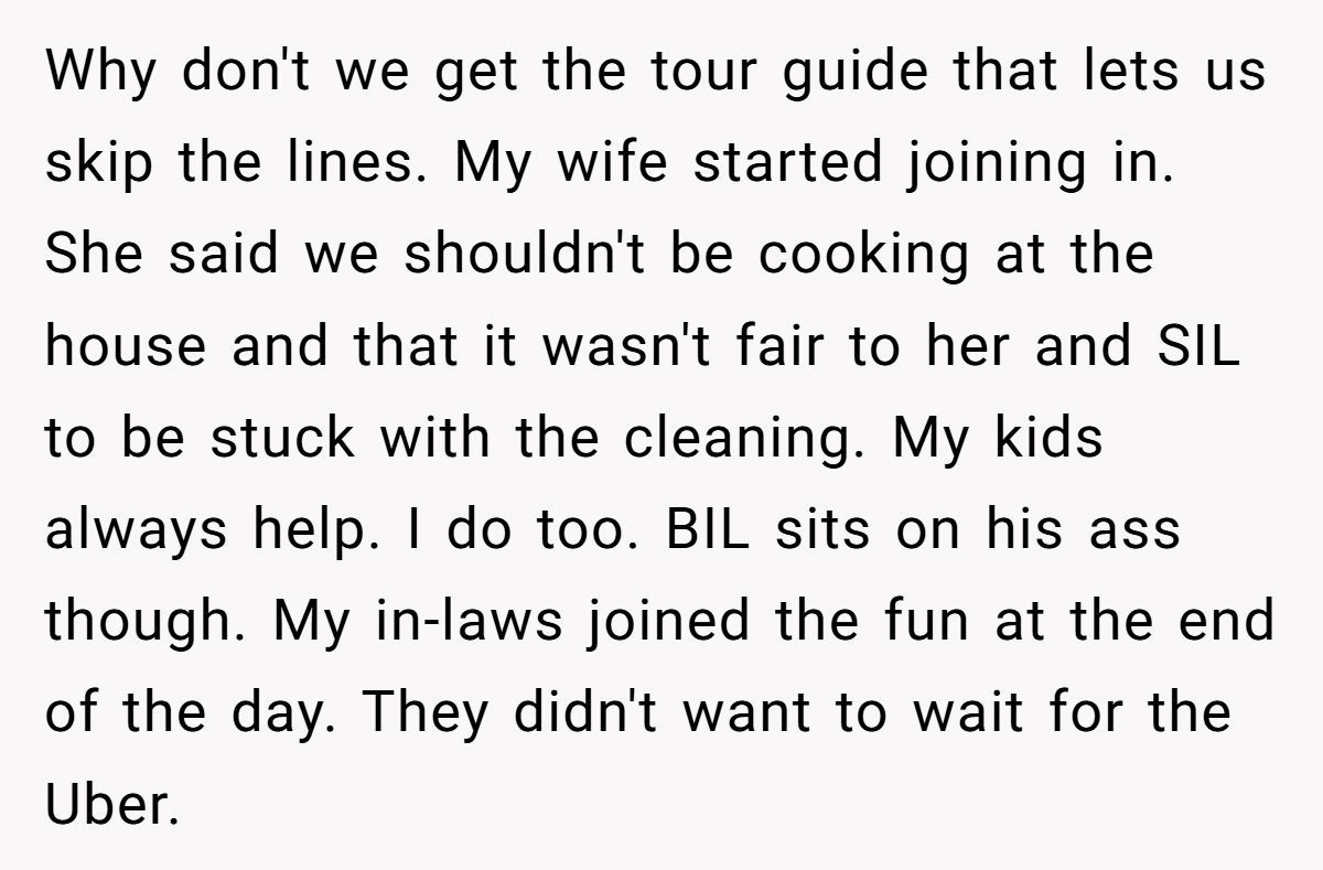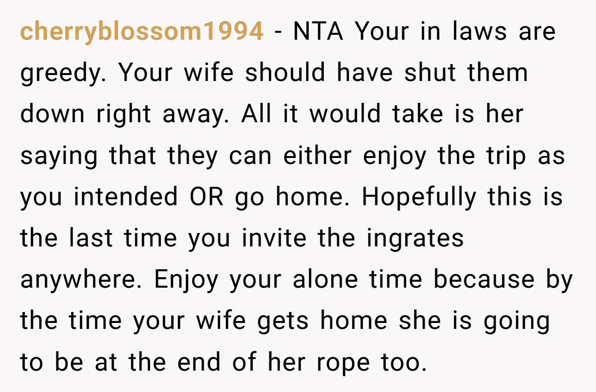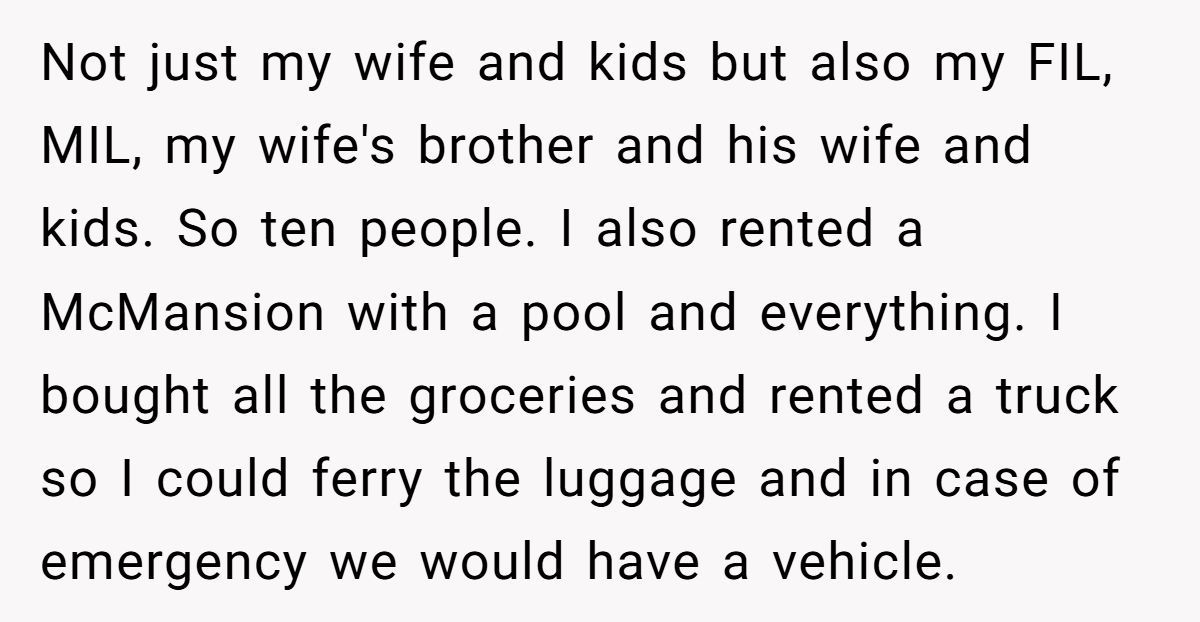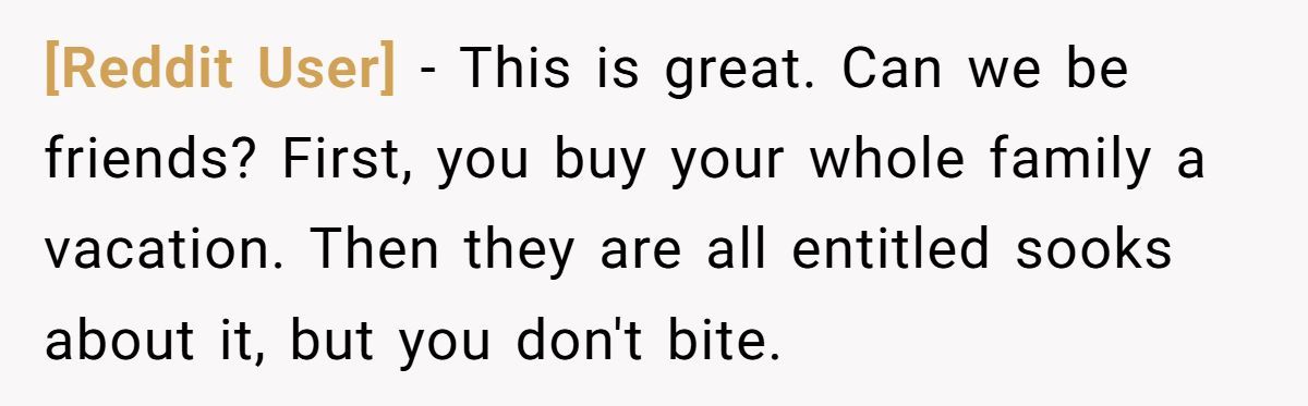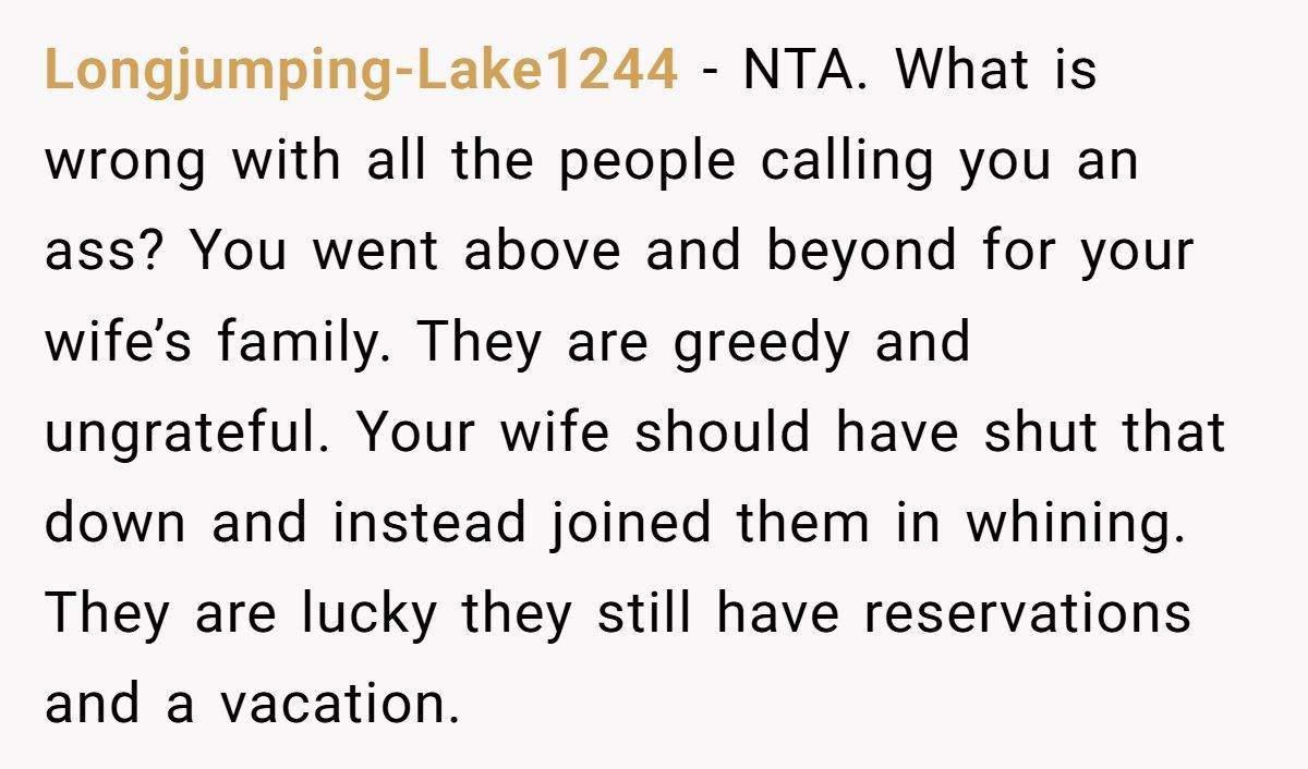 In this scenario, the Redditor was clearly the planner and provider. But once the others started demanding more, the role shifted from “hero” to “hostage.” His wife’s temporary alliance with her family added fuel to the fire. Yet, her eventual return to her husband’s side—especially with “beast mode” activated—shows how family dynamics can realign when boundaries are tested.