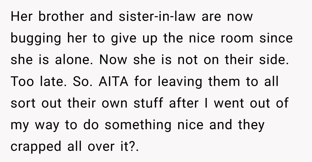 With every decision criticized—from who got the best room to why meals weren’t catered—this family vacation began to feel more like a hostage situation. So the Redditor made the boldest move of the trip: disappearing to a hotel suite with his loyalty points and leaving the chaos behind. Want to know if he was the villain or the hero of this family drama? Scroll down for the full saga!