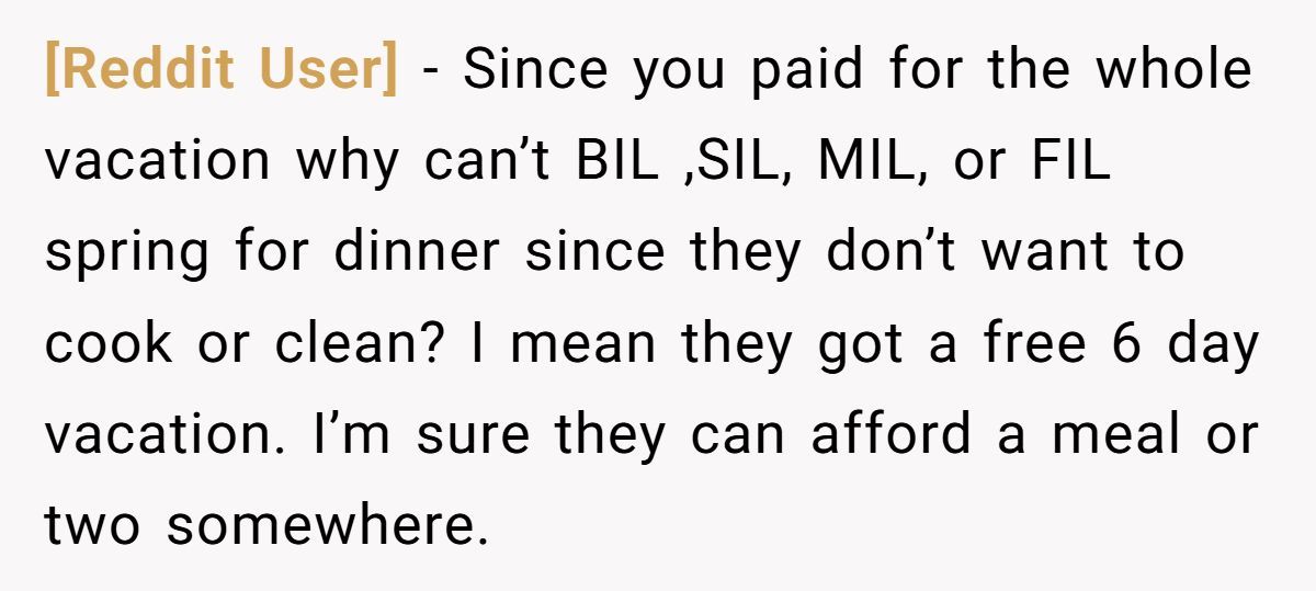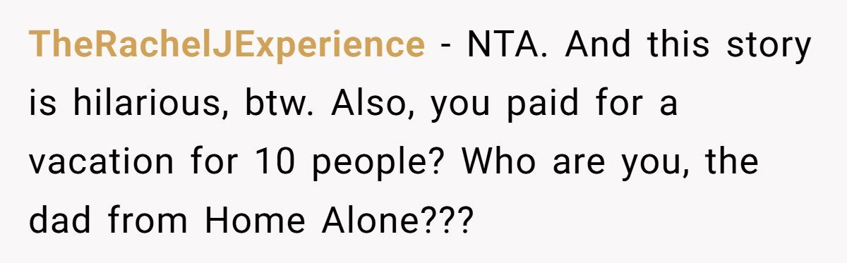 In this case, the Redditor went above and beyond. Covering the costs for ten people, including accommodations and groceries, is no small feat. But when the trip turned into a complaint-fest over who had the bigger TV or who had to cook, it’s not surprising that resentment started bubbling. What began as generosity quickly turned into frustration—and eventually, self-preservation.