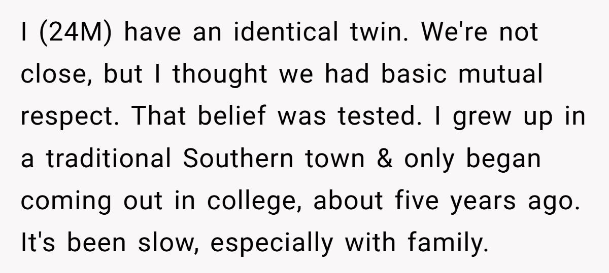 Family can resemble a tug-of-war, especially when identity meets tradition. Even identical twins can occupy vastly different emotional spaces, and when one is still finding acceptance, that contrast becomes unavoidable.