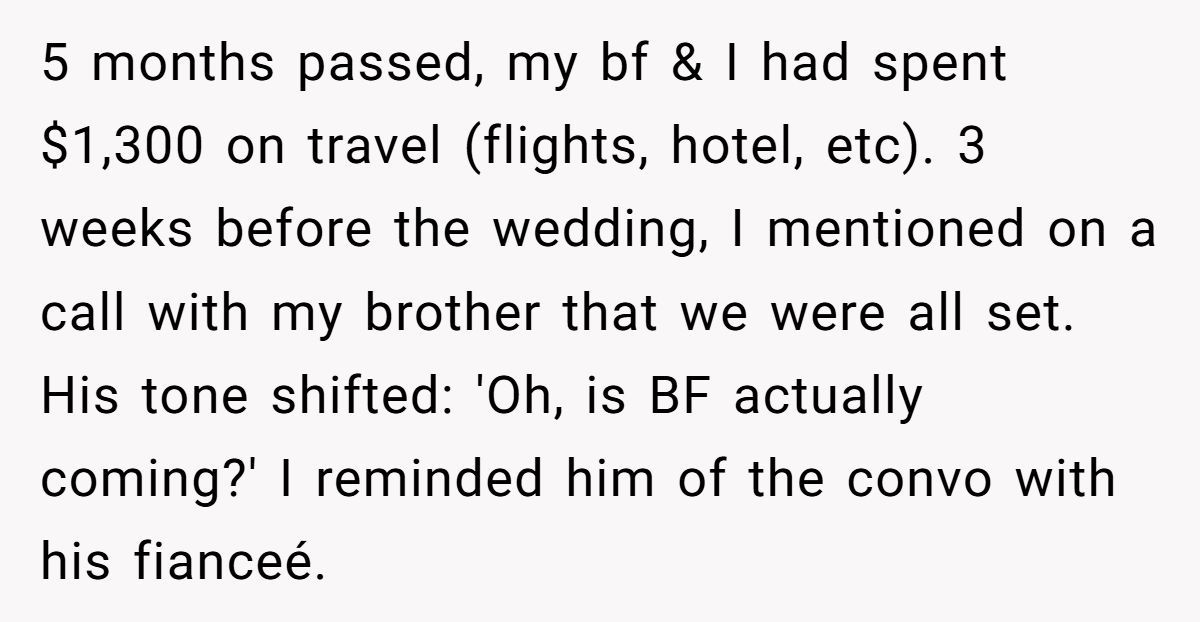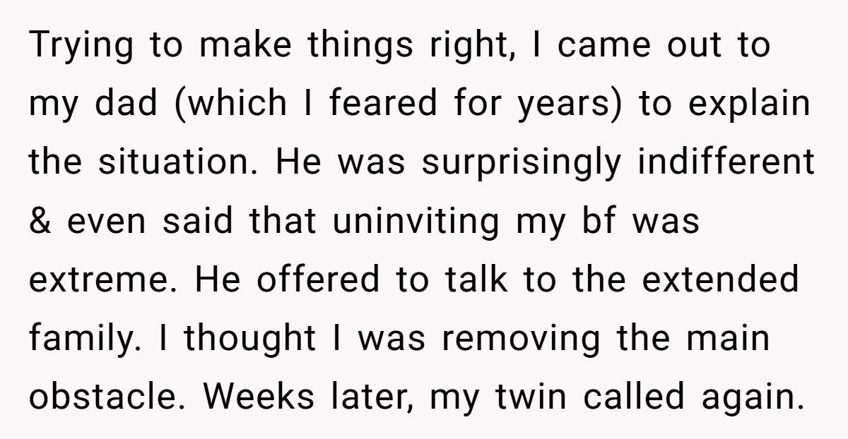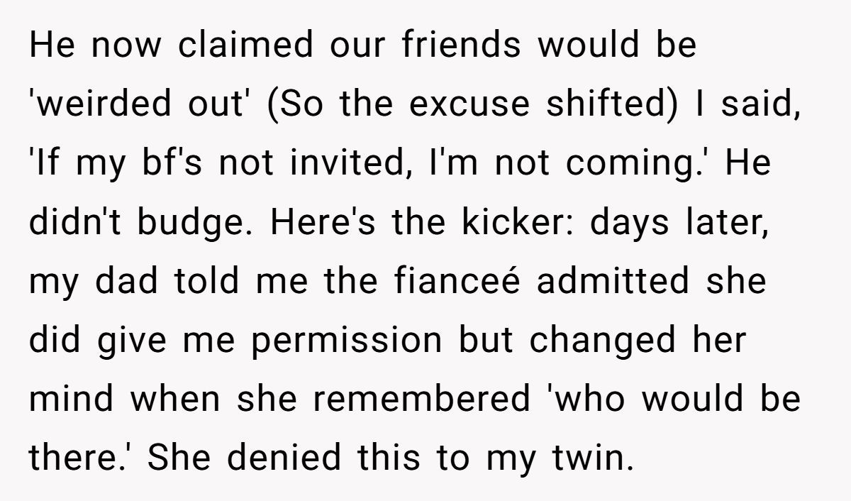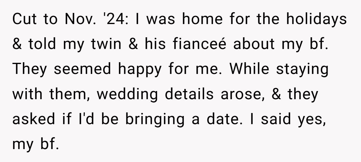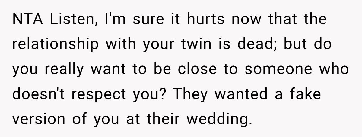 Imagine being invited to your twin’s wedding, carefully planning for months with your boyfriend, only for the invitation to suddenly vanish—and your presence demanded without your partner. One Redditor’s twin swapped permission at the eleventh hour, citing family judgment, forcing him to choose between appearances and principles.