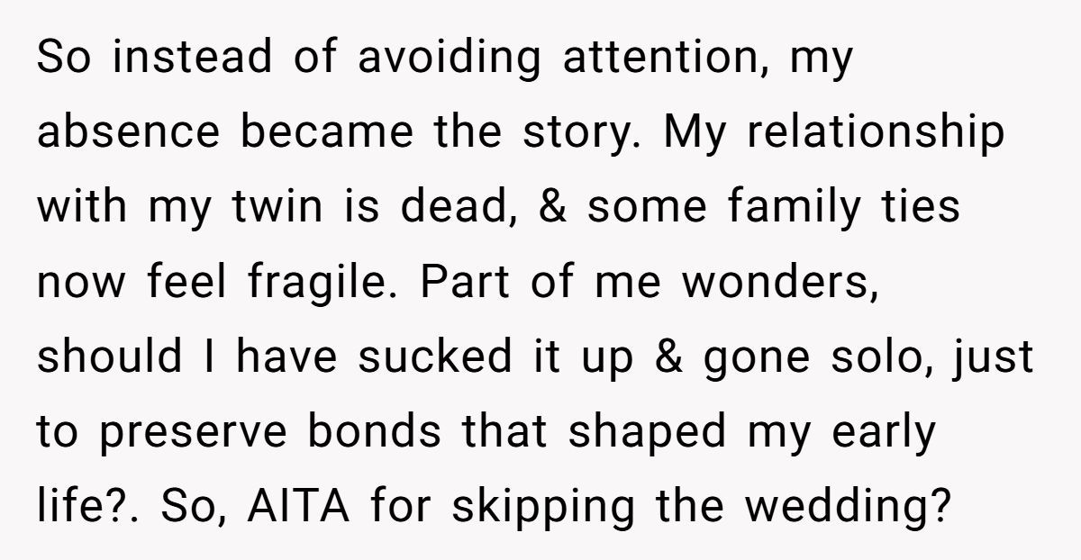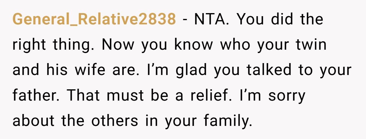 In the comments, these Redditors praised OP’s efforts to resolve the issue, arguing the twin and fiancée’s dishonesty and exclusion justified his absence