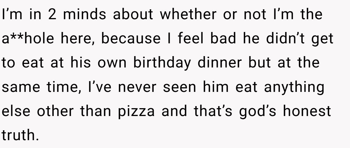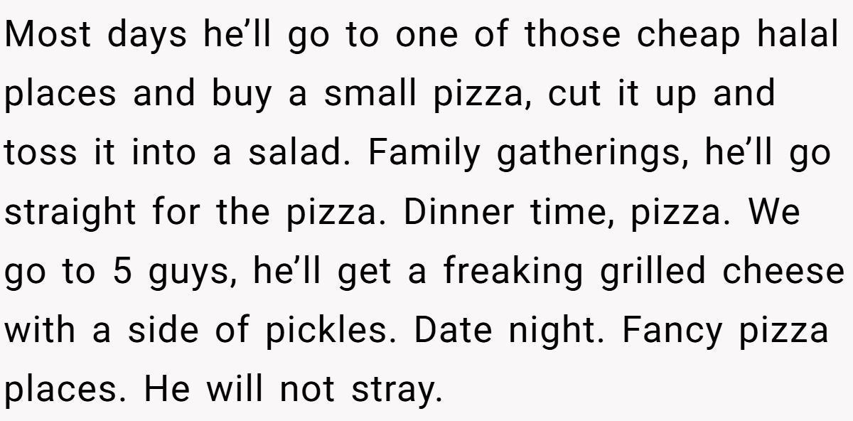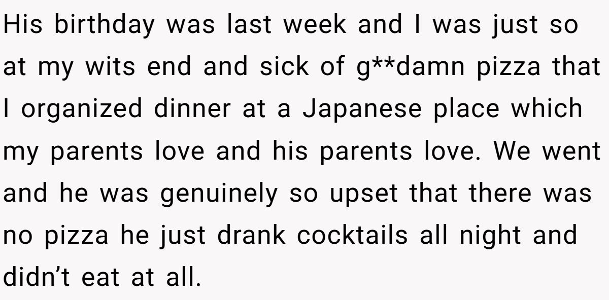 Do you think she crossed the line by hijacking his birthday dinner plans, or was it fair to finally mix things up after three years of melted cheese monotony? Would you stick around for a partner who refuses to eat anything but pizza? Sound off in the comments—we’re ready for your hot takes.
