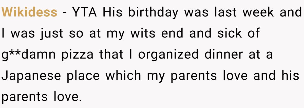 One woman’s frustration with her boyfriend’s pizza-only diet led her to plan a birthday dinner at a Japanese restaurant, sparking tension when he refused to eat