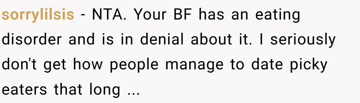 Some Reddit commenters suggested her boyfriend’s eating might fall under Avoidant/Restrictive Food Intake Disorder (ARFID), a recognized condition where individuals severely limit the variety of foods they consume. According to the National Eating Disorders Association, ARFID often stems from fear, sensory issues, or past negative experiences, and it can persist into adulthood.