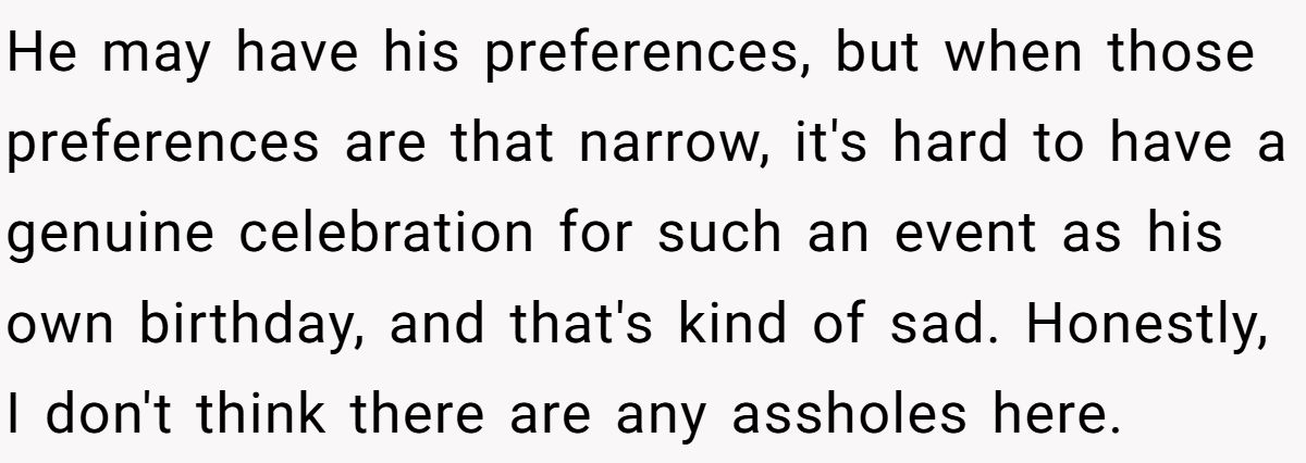 Still, it’s worth asking: should one person’s restrictive diet define every shared meal? A birthday dinner may seem like a symbolic battleground, but it also highlights a bigger question: when is personal preference just a quirk, and when does it become an obstacle to shared life experiences?