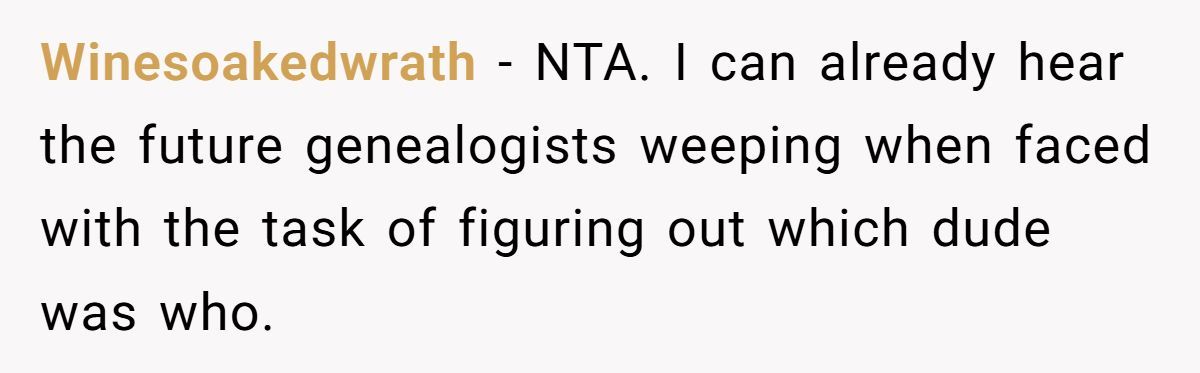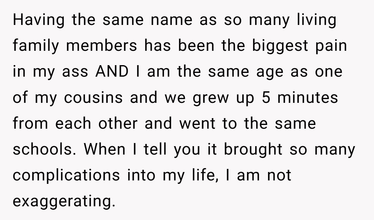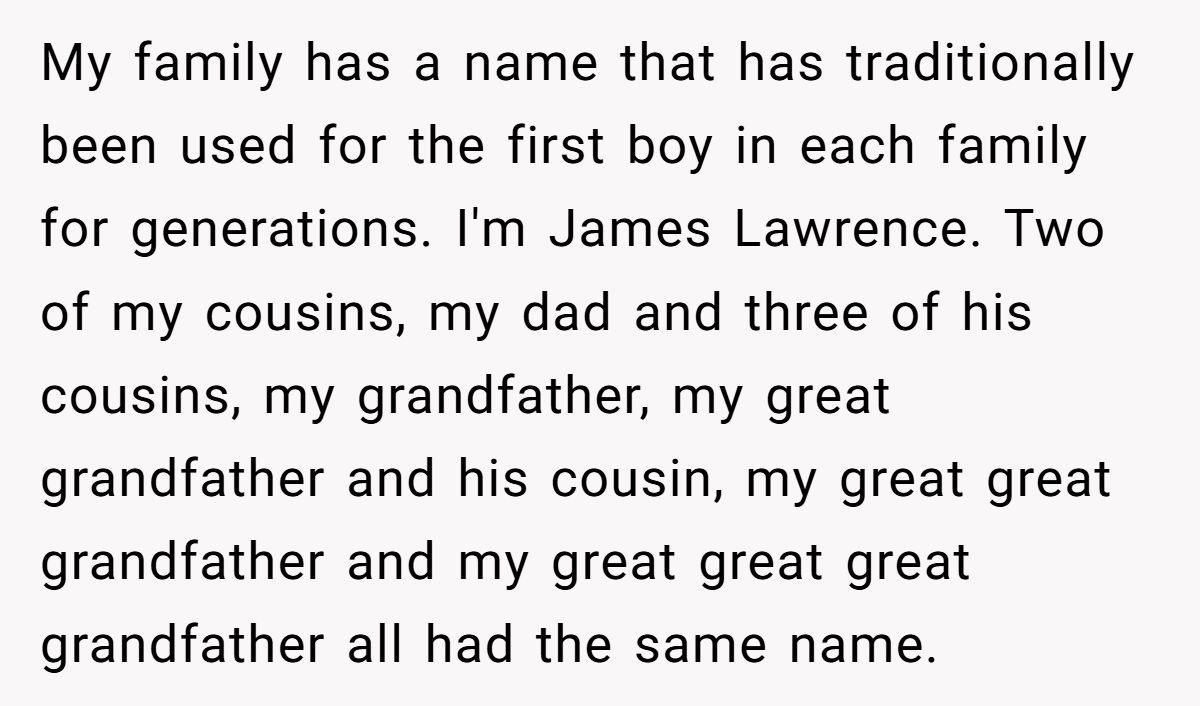 A Redditor just drew the line in the sand, and the fallout is real. For generations, the men in his family have passed down the same name—James Lawrence—to the firstborn son. Sounds regal, right? Except this soon-to-be dad grew up sharing not only the same name but the same neighborhood and schools with another cousin named James Lawrence. And now that he’s expecting a son of his own, he’s made it clear: this naming tradition stops with him.