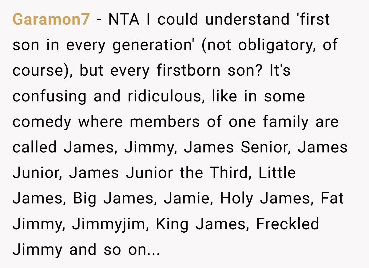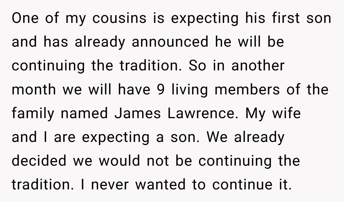 Naming a child is one of the most personal choices a parent can make, yet for one Redditor, it’s become a battleground with his family. Expecting a son, he and his wife decided to break a generations-long tradition of naming every firstborn boy James Lawrence, a name shared by nine living relatives, including himself. Tired of the complications it caused in his own life, he firmly told his parents the tradition ends with him, and their opinions won’t sway him. Their hurt and accusations of childishness have left him wondering if he was too harsh.